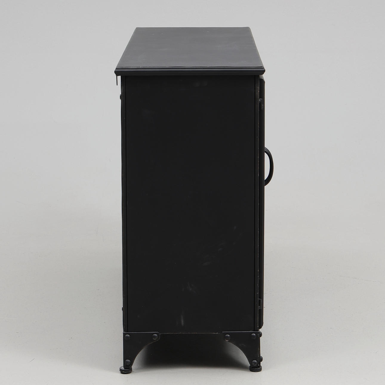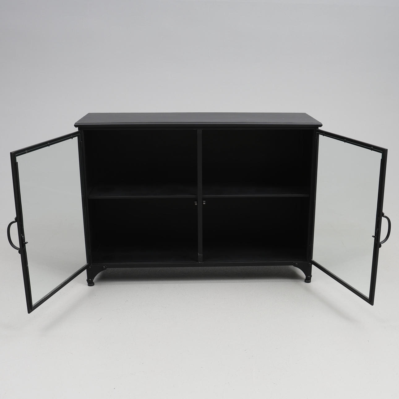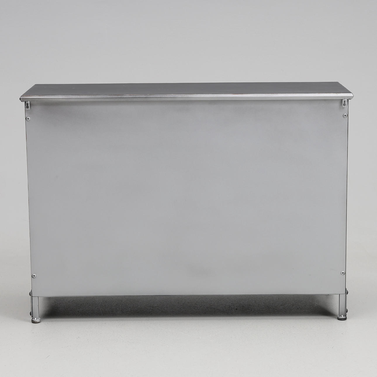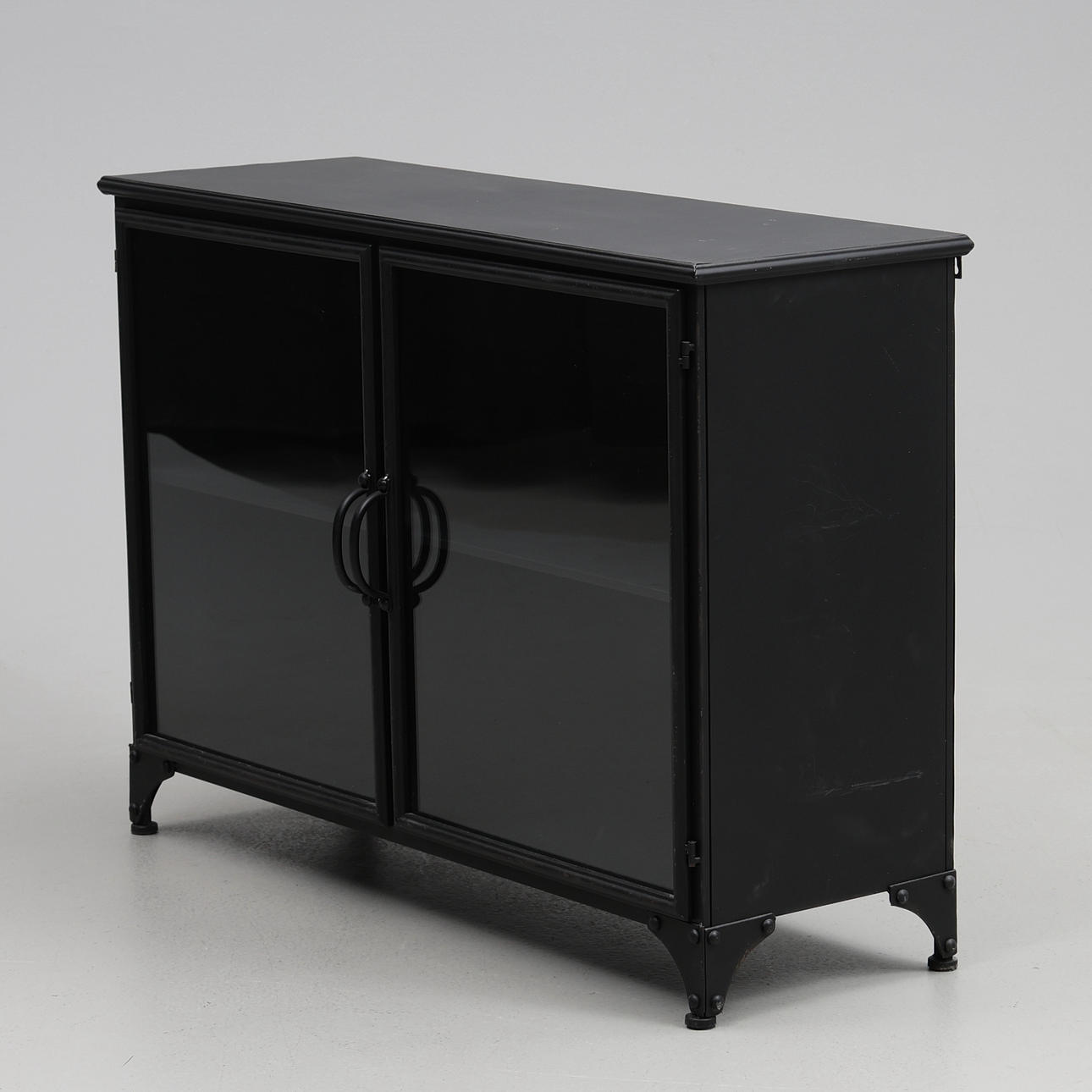 Plåtskåp med glasdörrar, ett hyllplan. Ca. 104 x 35 x 74 cm.