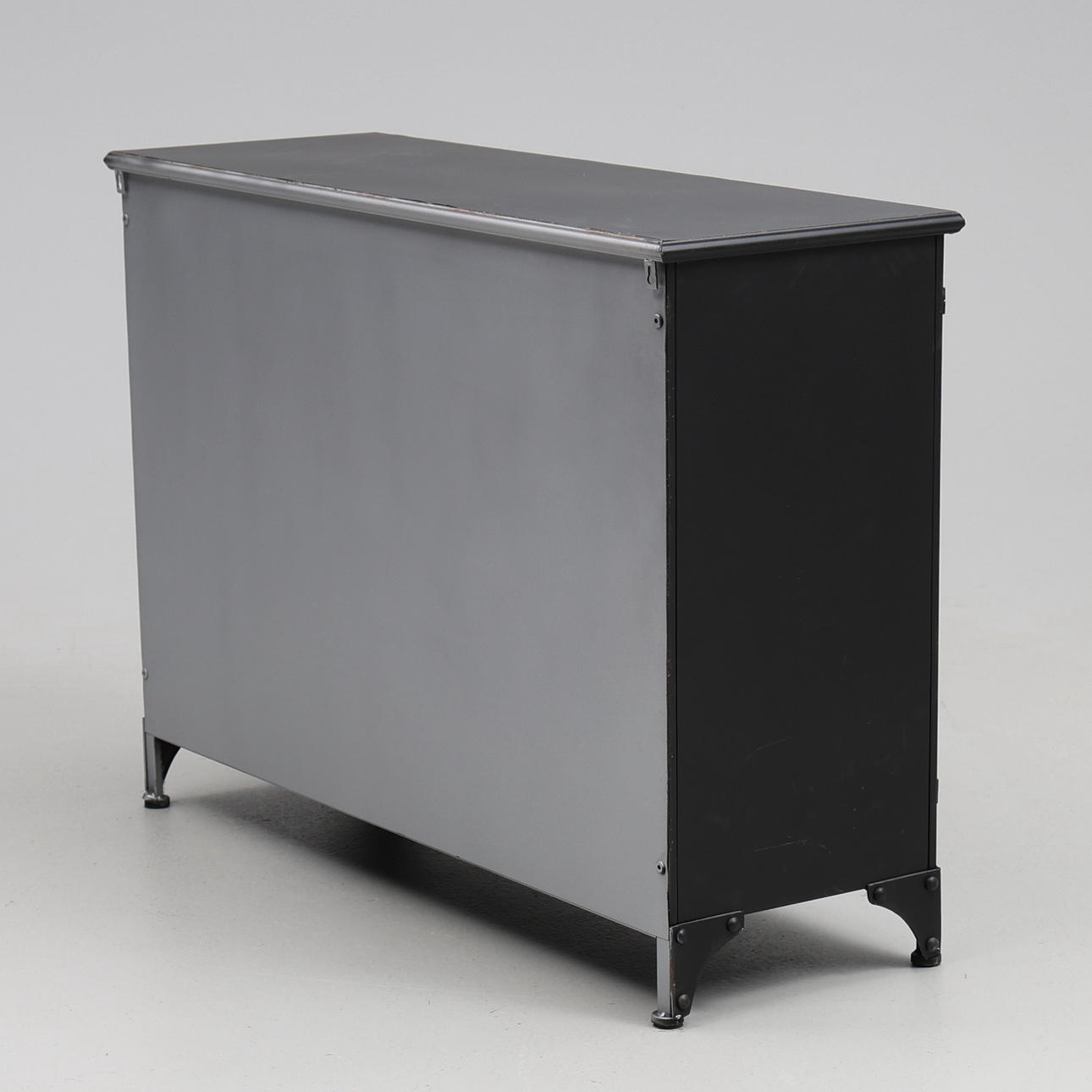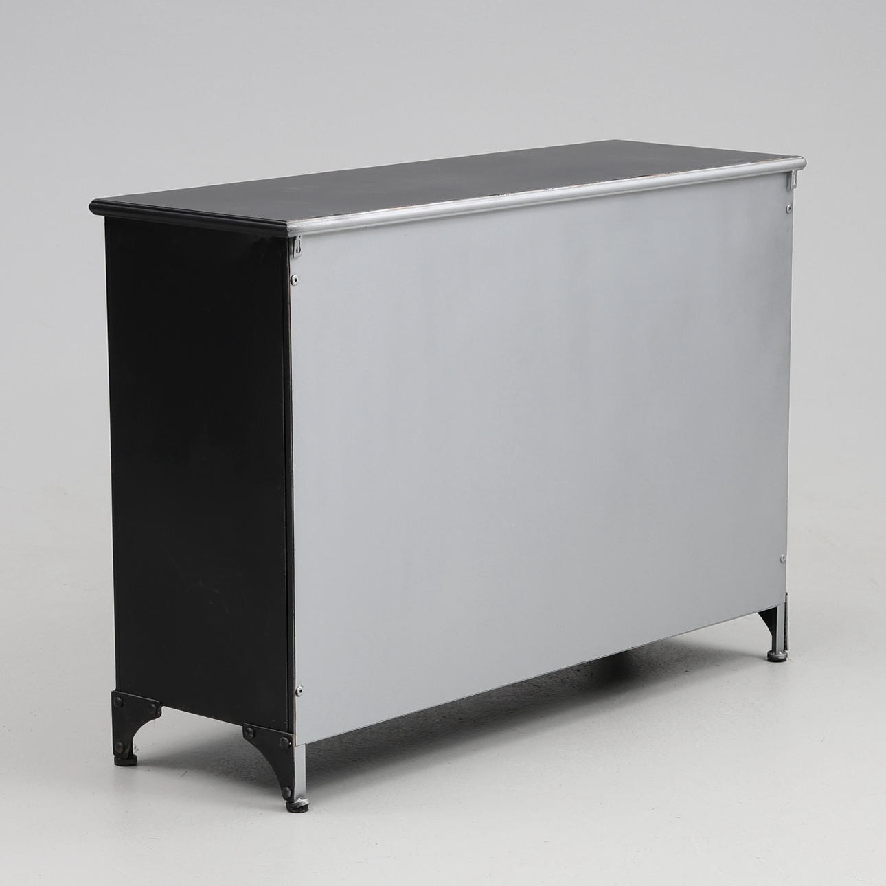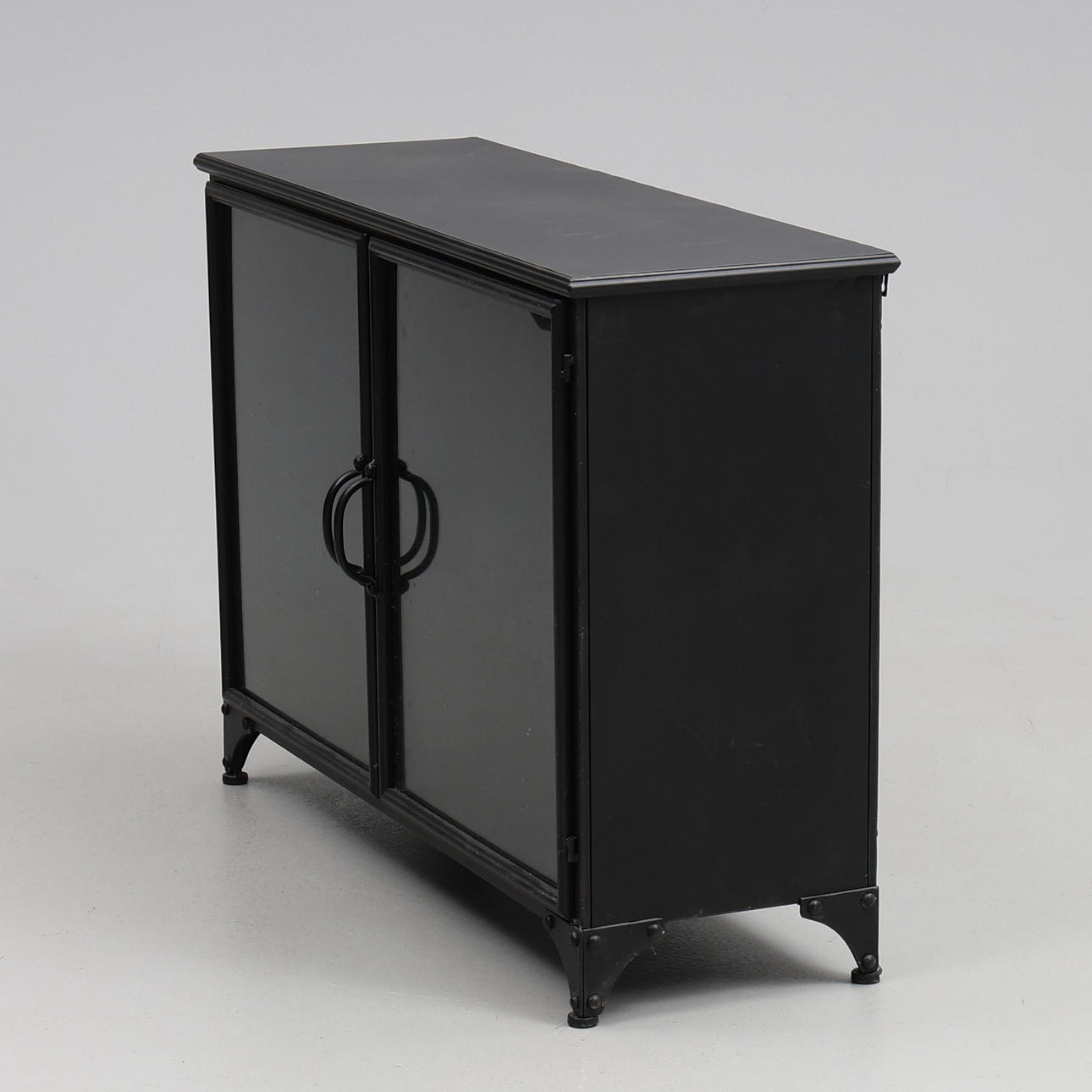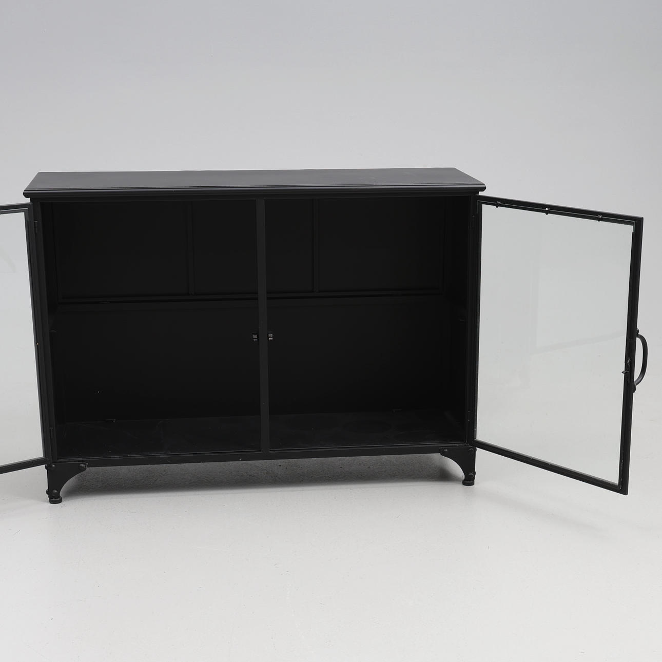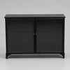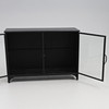 Plåtskåp med glasdörrar, ett hyllplan. Ca. 104 x 35 x 74 cm.