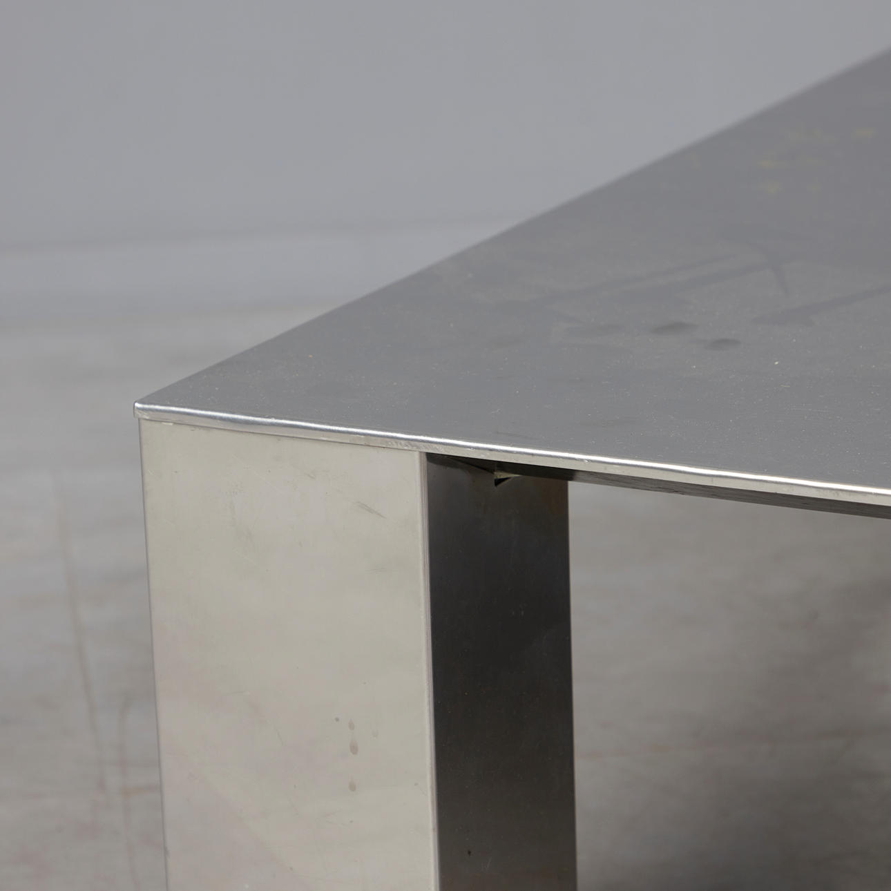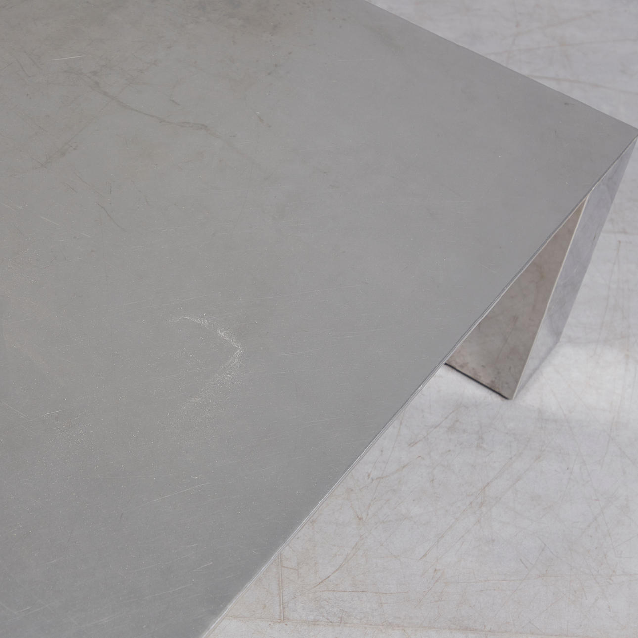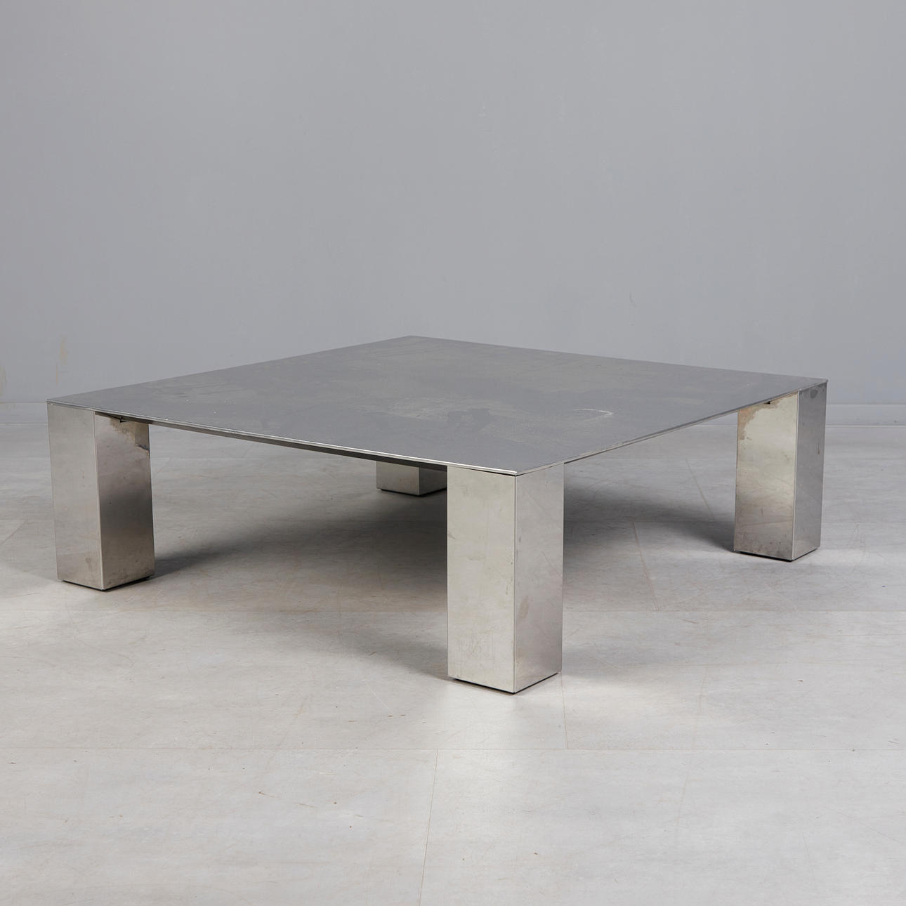Fyrkantigt soffbord med aluminiumbelagd träkonstruktion på fyra blockfötter, H.32,5 cm, W.99cm, D.99cm.