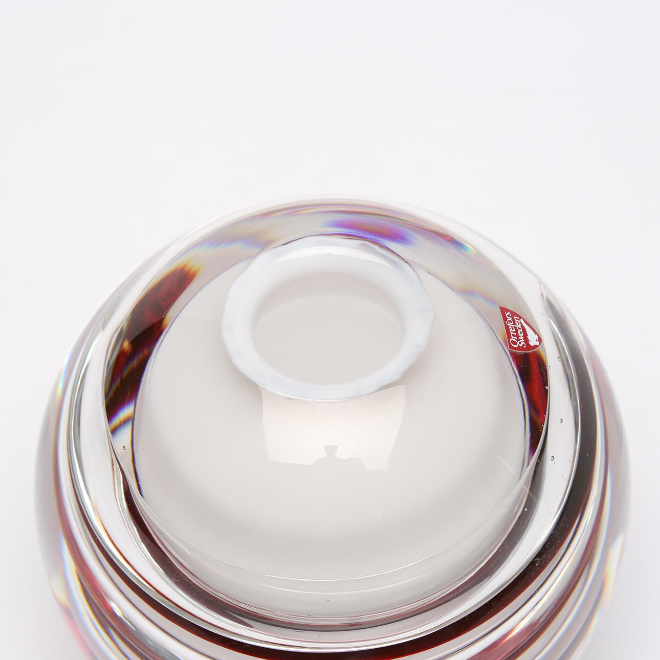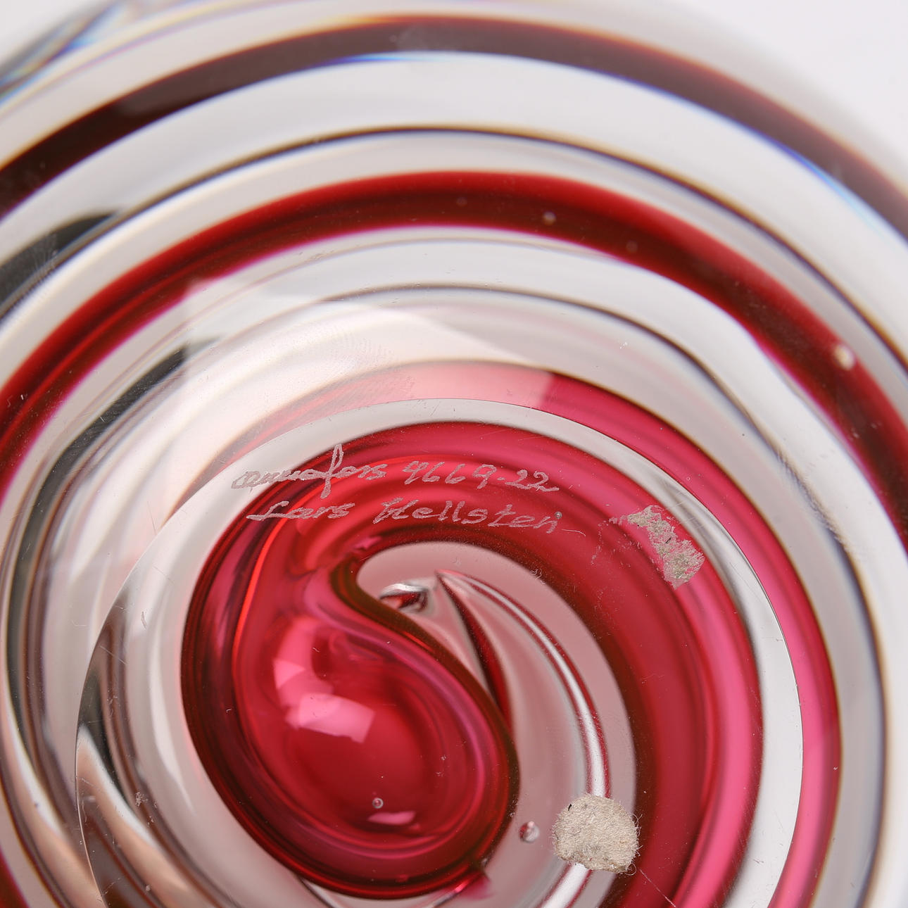 Med underfångsglas i vitt och rött/rosa. Etikettmärkt.