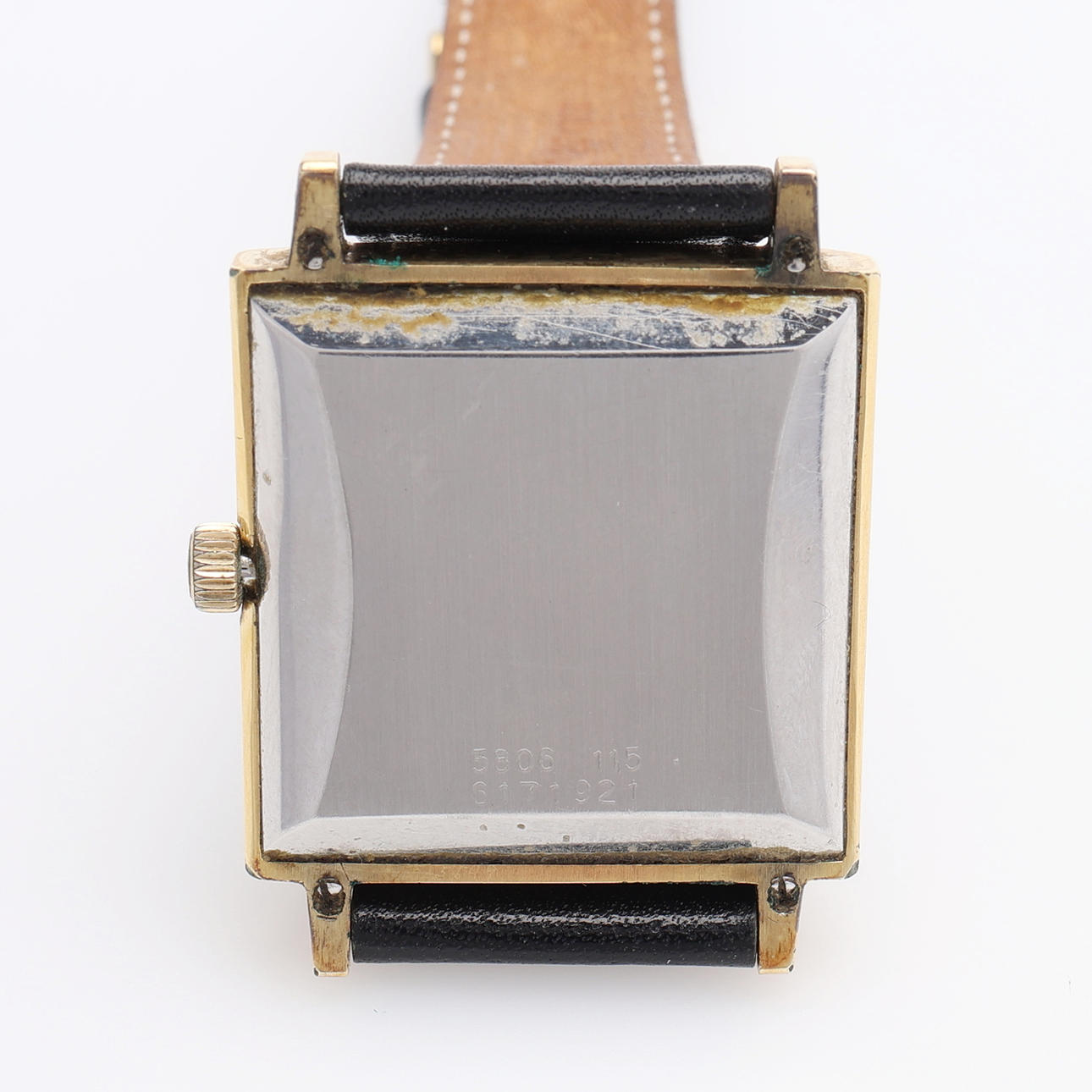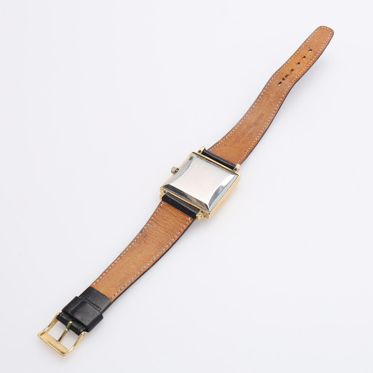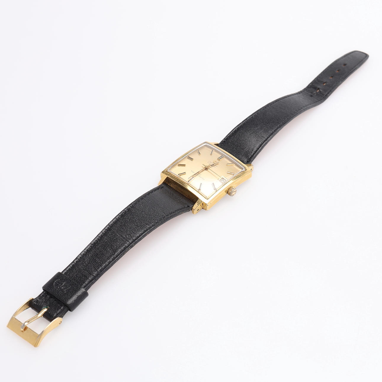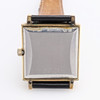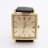 Kvadratisk urtavla, guld på stål, automatic, med datumvisning, ca 3x3 cm. Med läderarmband.