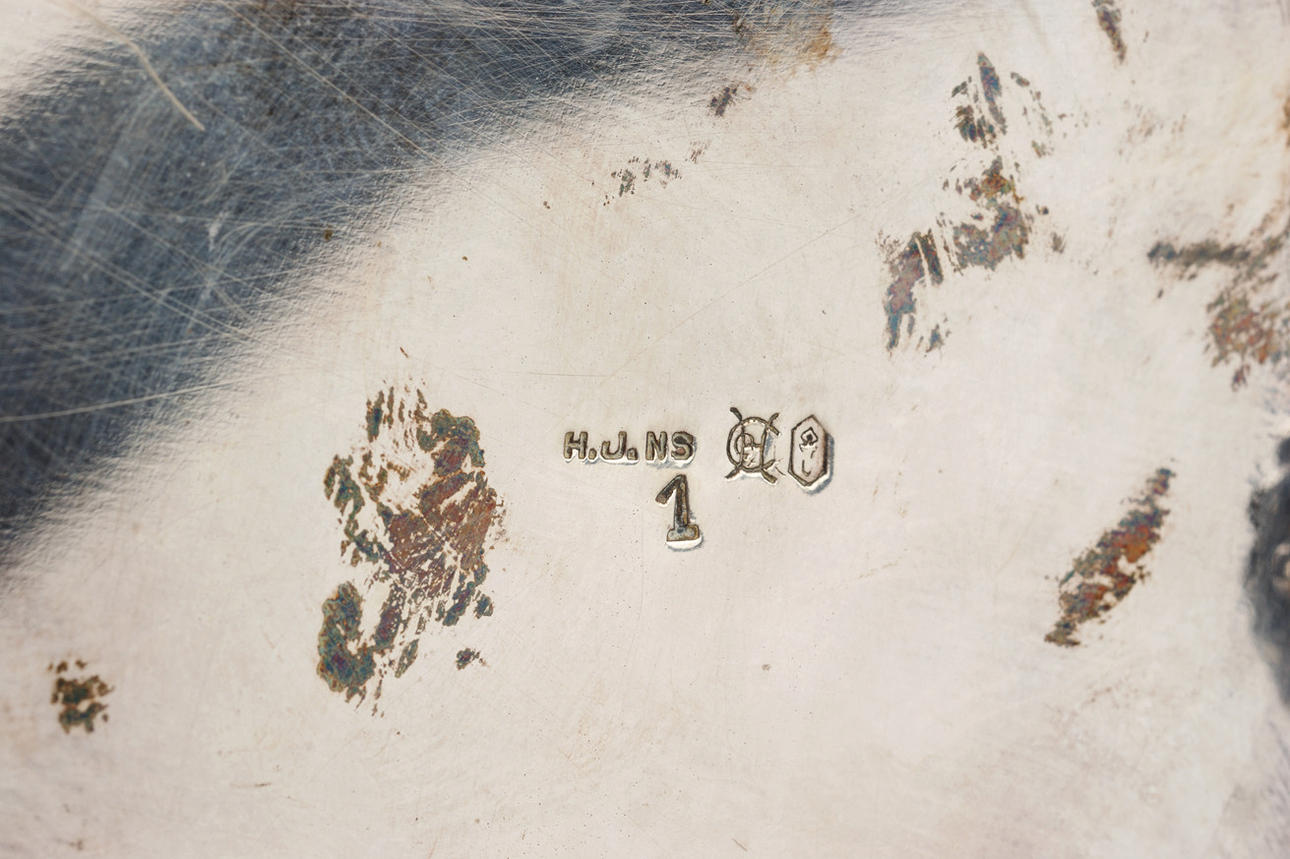 kulfötter, förgylld insida, enligt del 2 slag och präglade bokstäver HJNS 1.