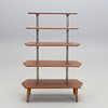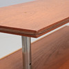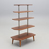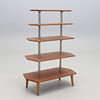 Ställning av förkromade stålrör. Hyllplan fanerade med teak. Ben av betsad bok. Bredd 90, djup 44,5, höjd 125,5 cm.