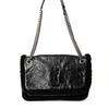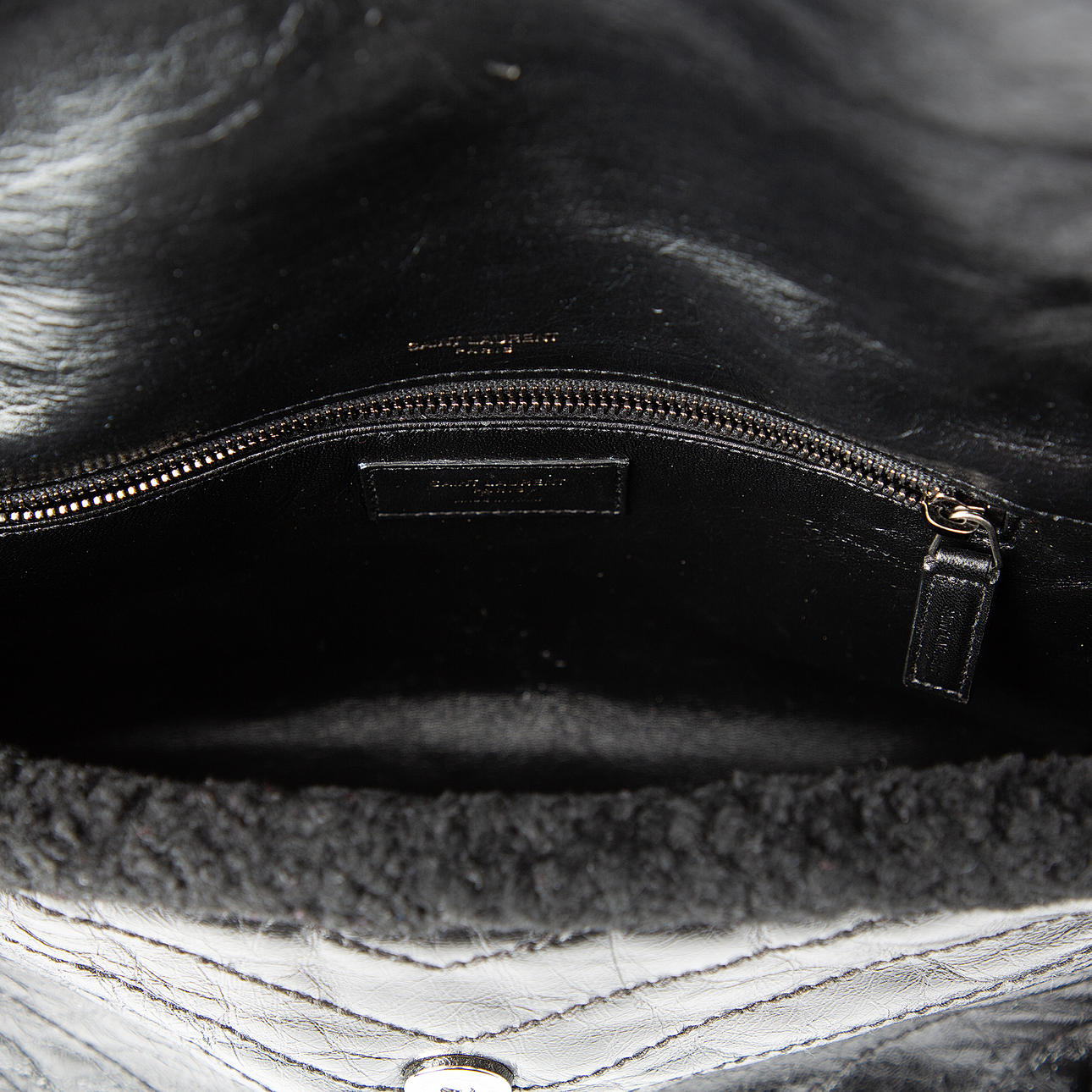 Kalvskinn i vintagelook. Fårskinnsbeklädda kanter. Kedja samt logotyp i metall. Bärs i enkelt eller dubbelt handtag.