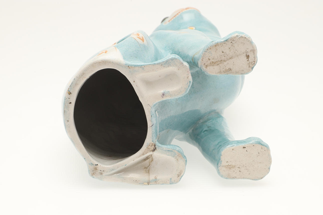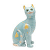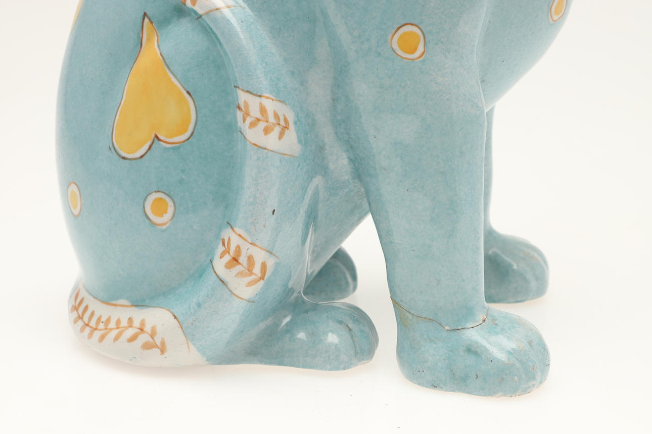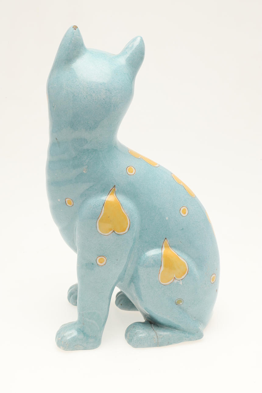 Möjligen av Mosanic, keramikkatten med infällda glasögon, med en turkosglaserad kropp och målad med gula hjärtan och annan dekoration. Vissa skador, 33,5 cm hög.