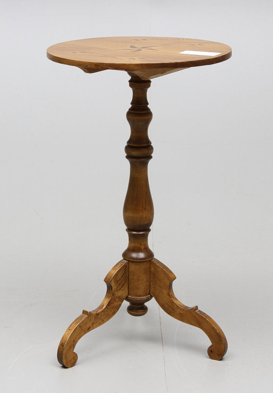 Rund form med vippbar skiva. Inläggningar med bl. a stjärna.Diameter 43, höjd 75 cm.