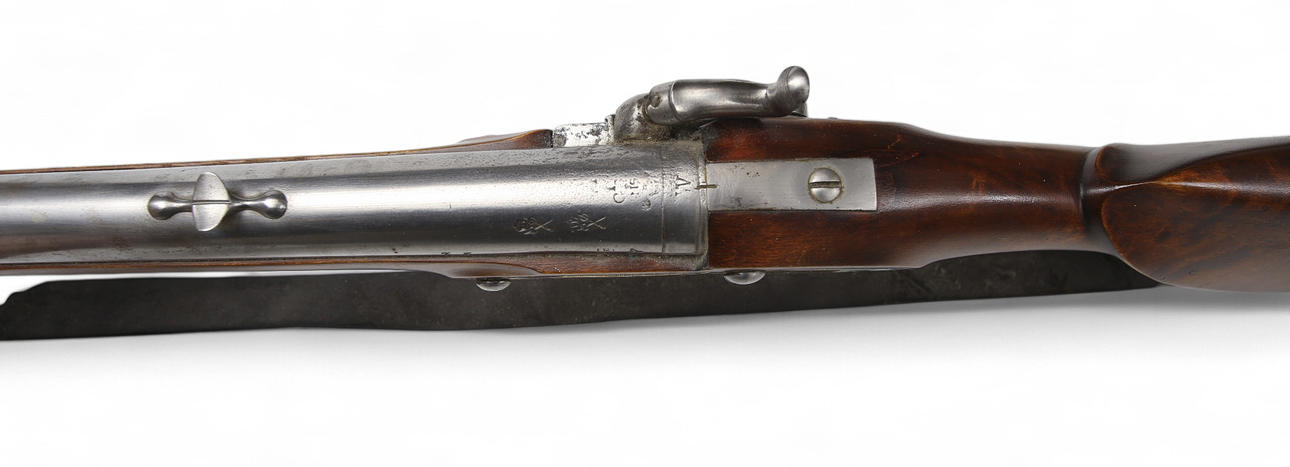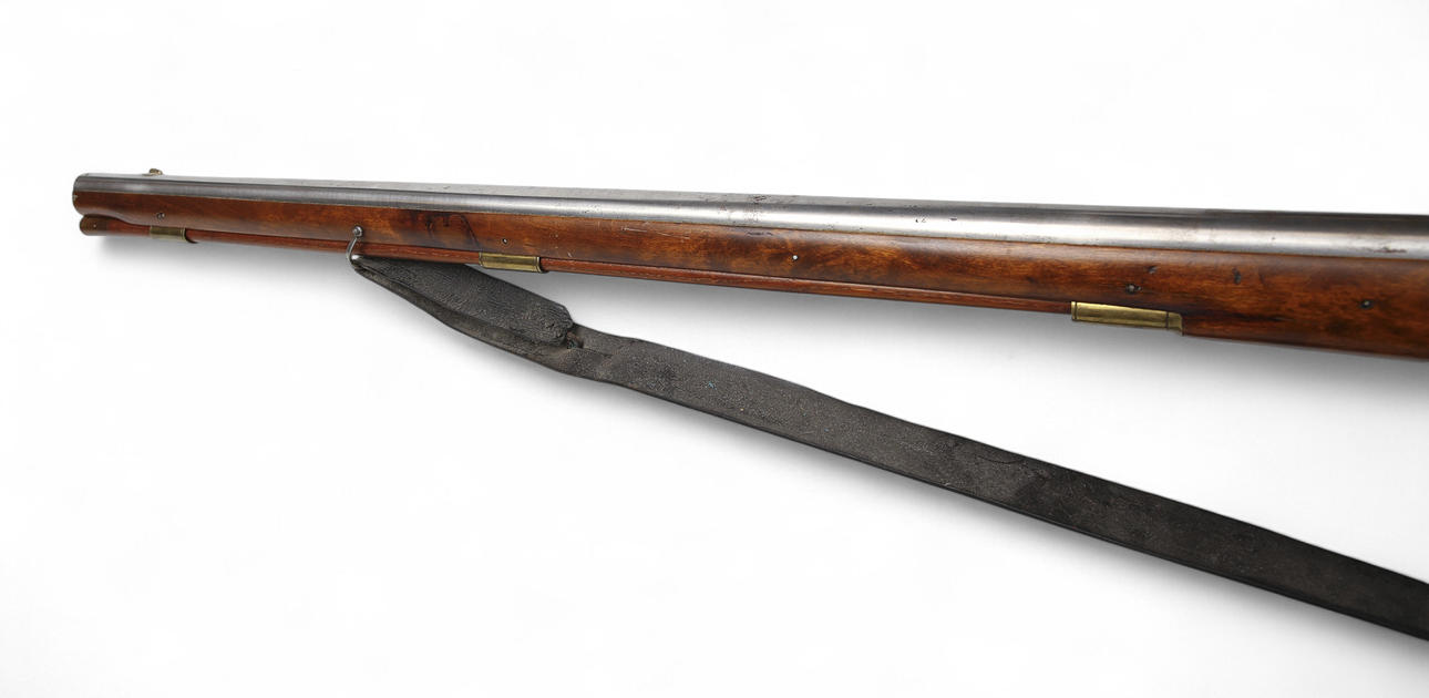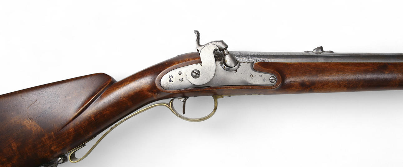 Svenskt slaglåsgevär från ca 1850-talet med en brittisk pipa från ett sk Towergevär. Beslag i mässing, stock i björk. Håller i hel och halvspänn. Kommer med läderrem.