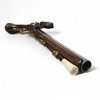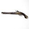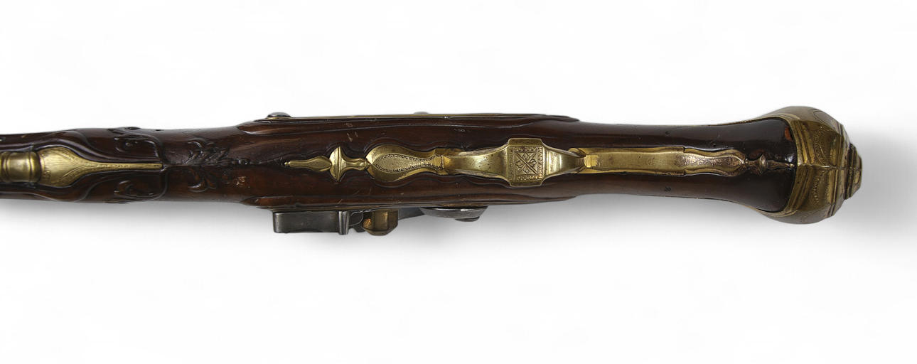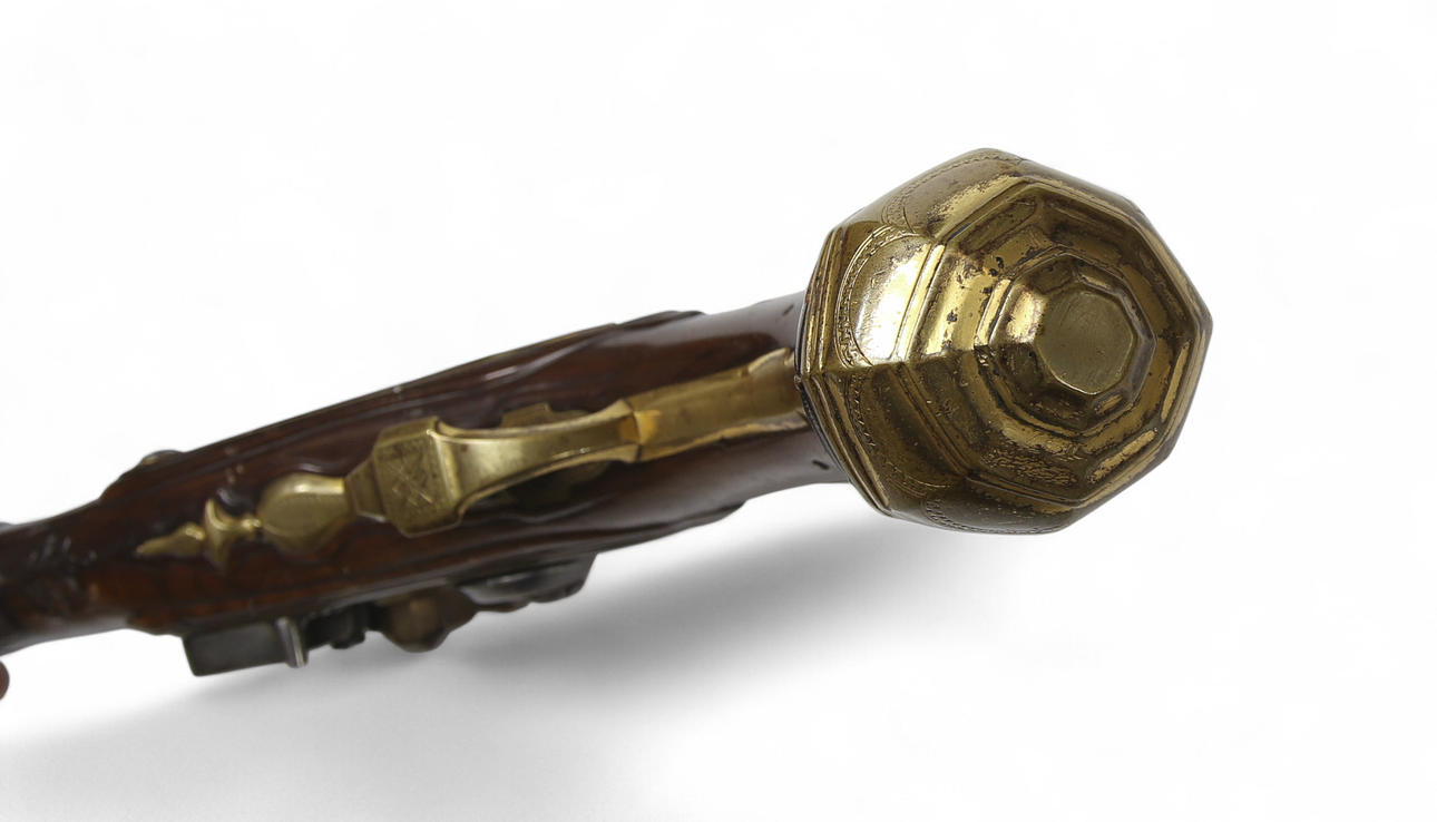 Tysk flintlåspistol från 1750-talet med pipa med ortogonalt kammarstycke, förgyllda mässingsbeslag, låsbleck i mässing. Skuren stock i valnöt.