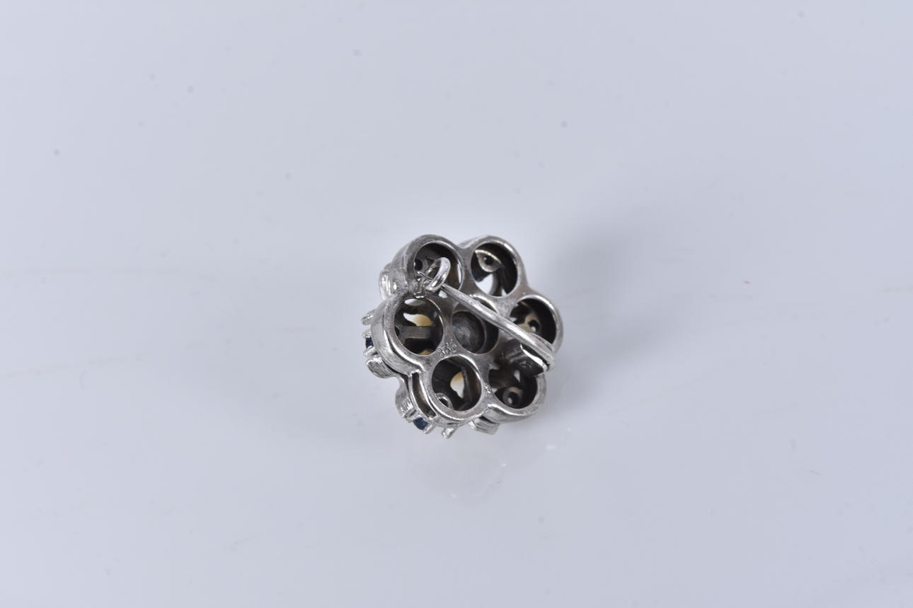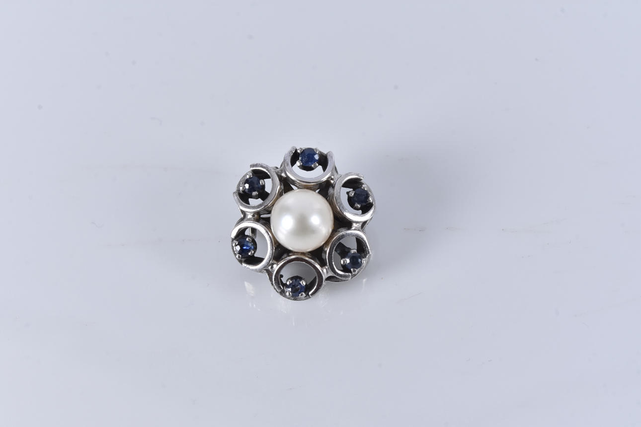 BROSCH, med blå stenar och pärla, silver.