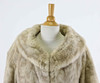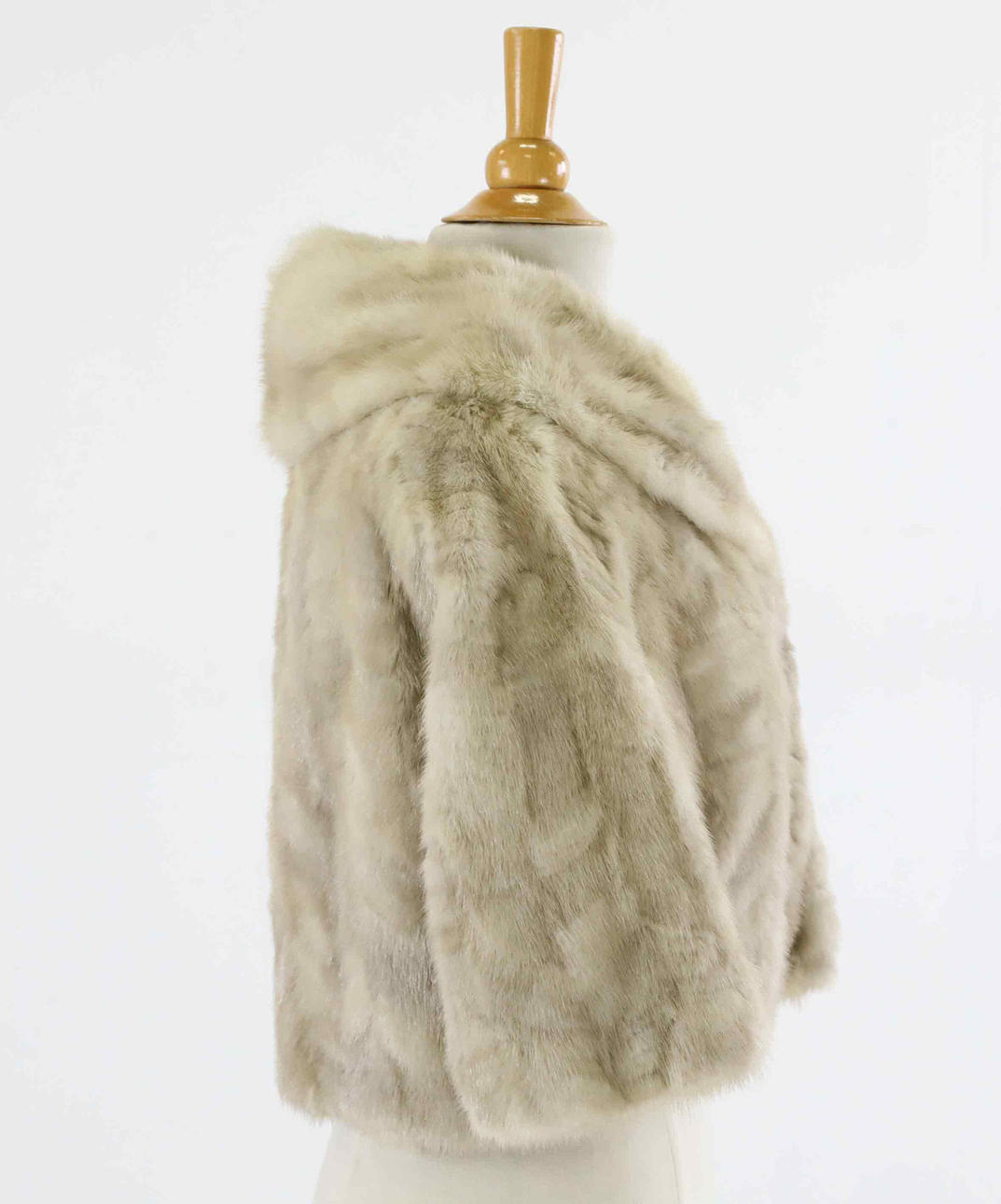 Helfodrad ljus minkjacka, 3/4 ärm, stor sjalkrage, hakar och hyskor.