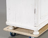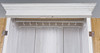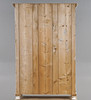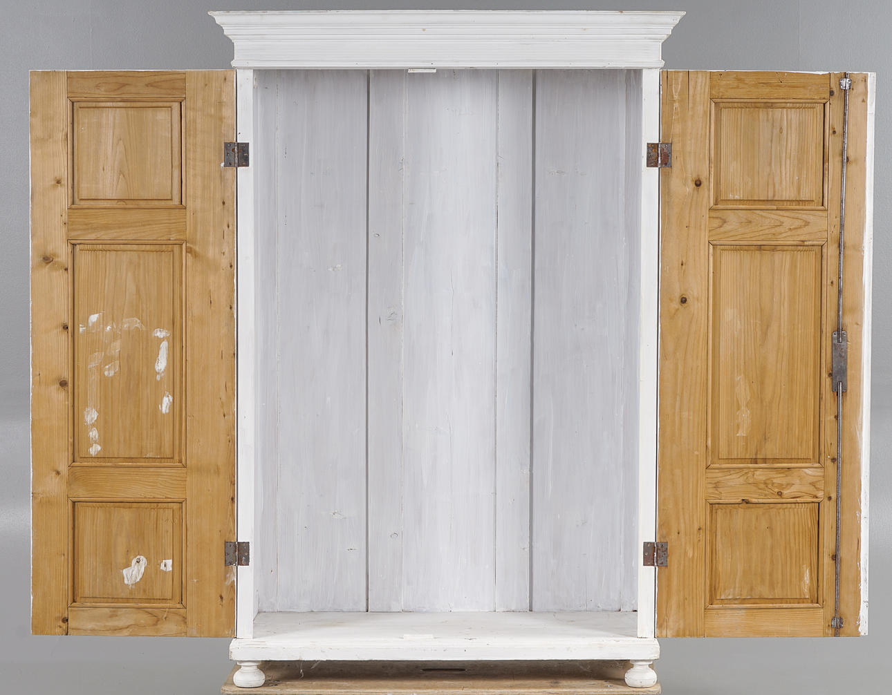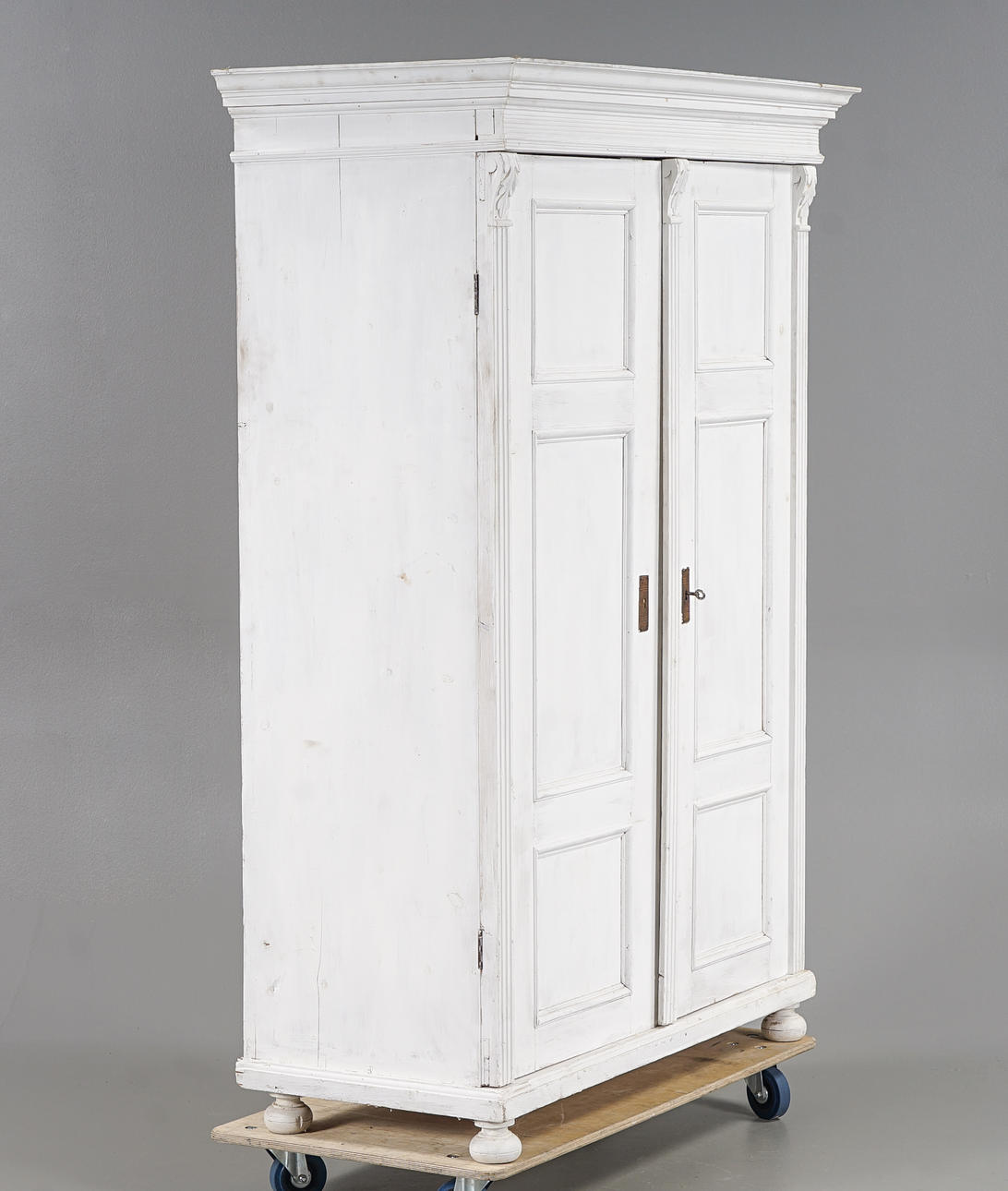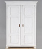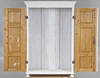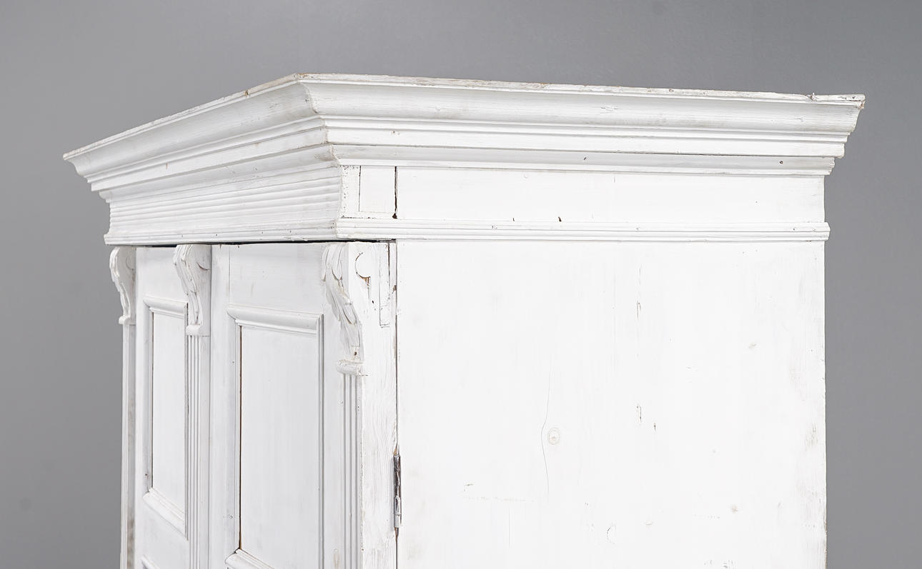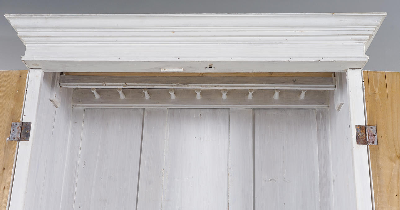 Vitmålat, skuren och kannelerad dekor, står på kulfötter. Inrede med klädstång.