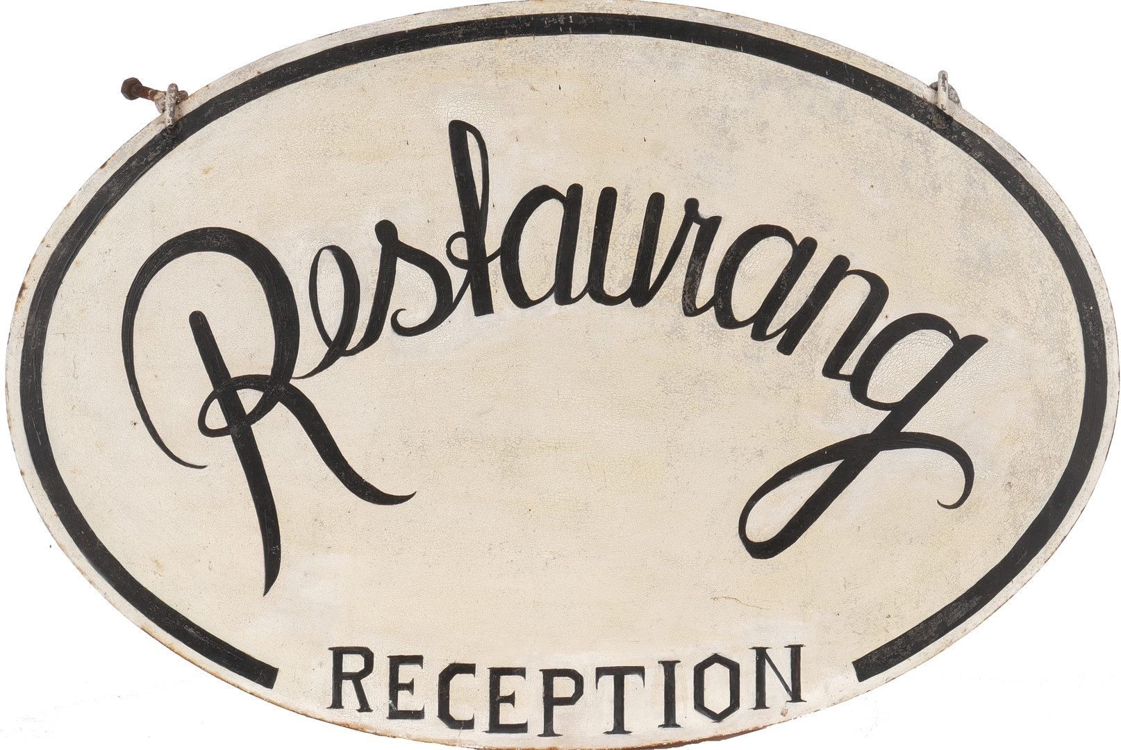 4241658. JÄRNSKYLT, "Restaurang Reception", dubbelsidig.
