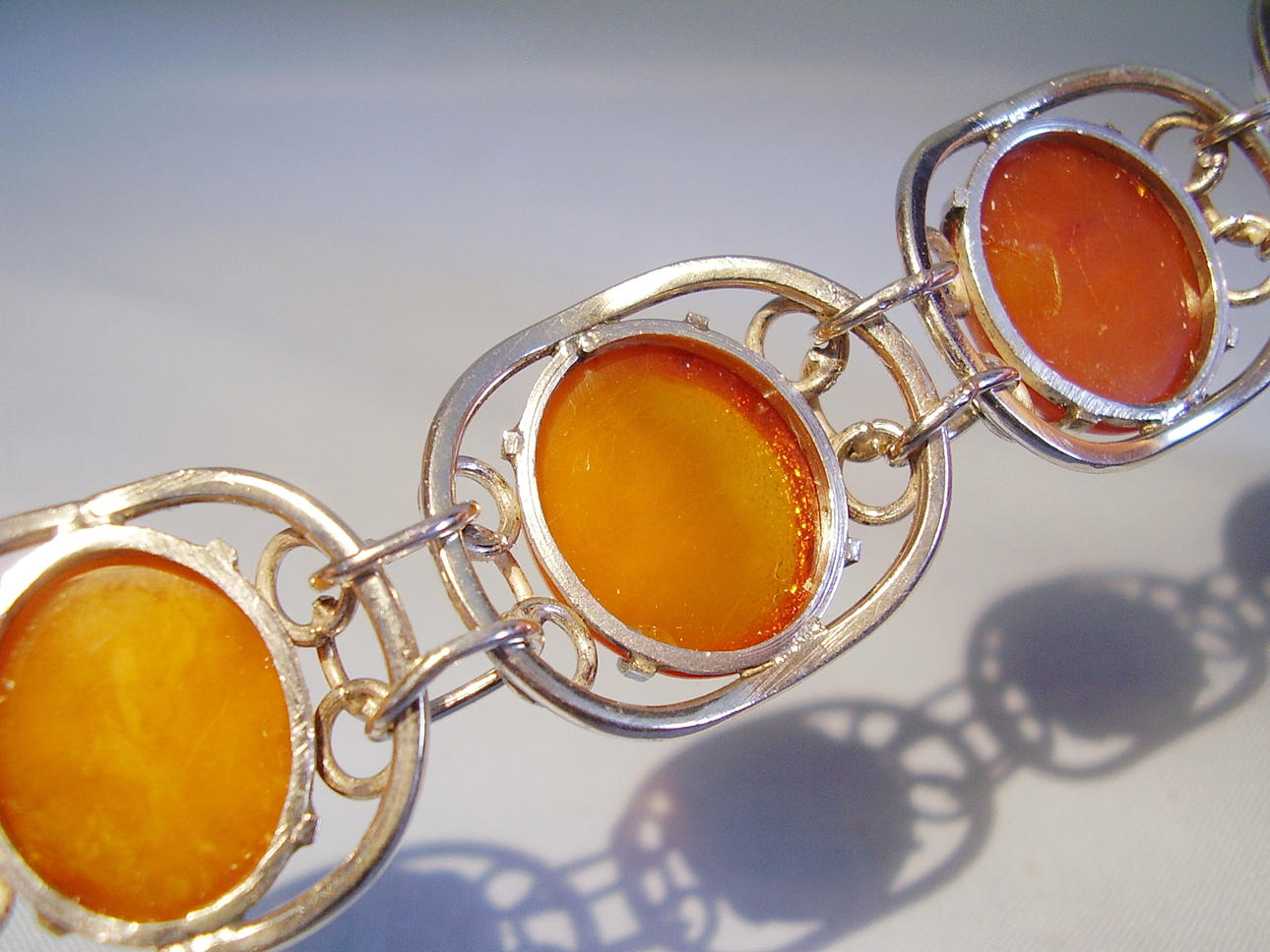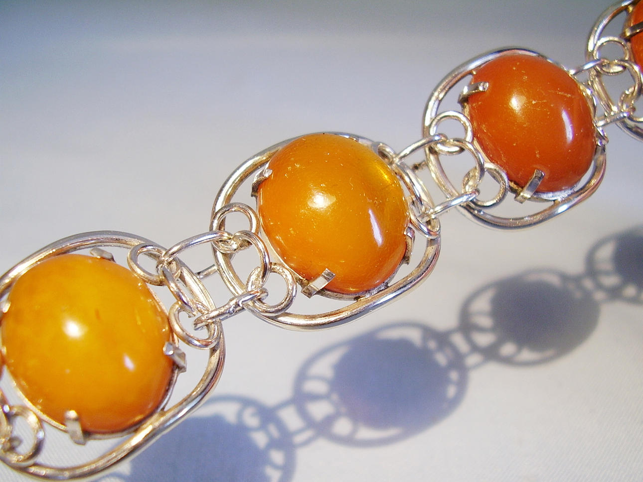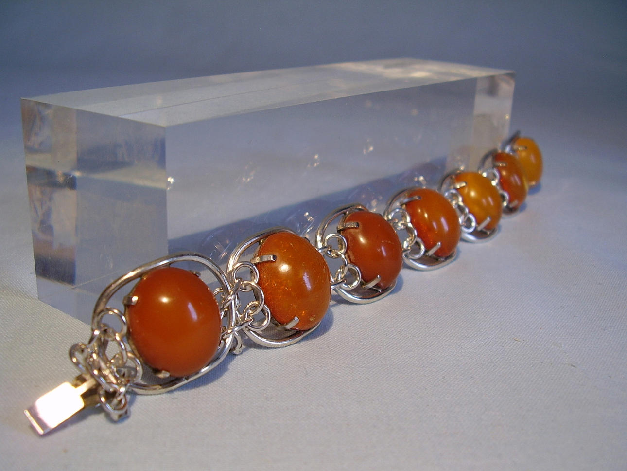 Längd 19 cm, bredd 2 cm, bärnsten cabochons 18 x 15 mm, vikt 28,3 gram.
