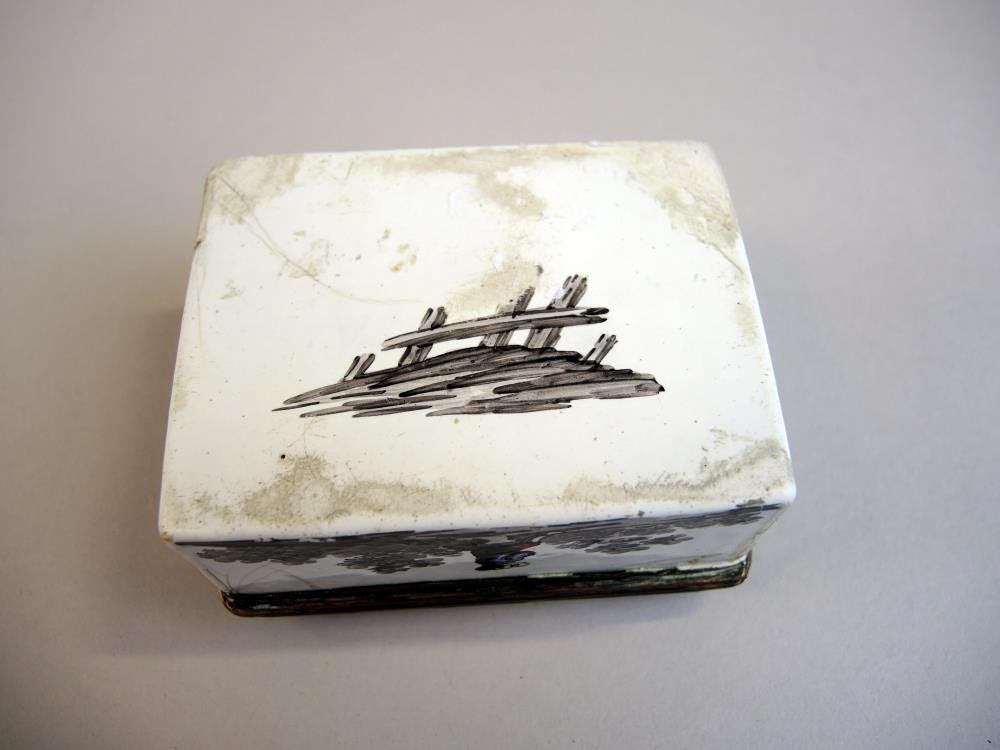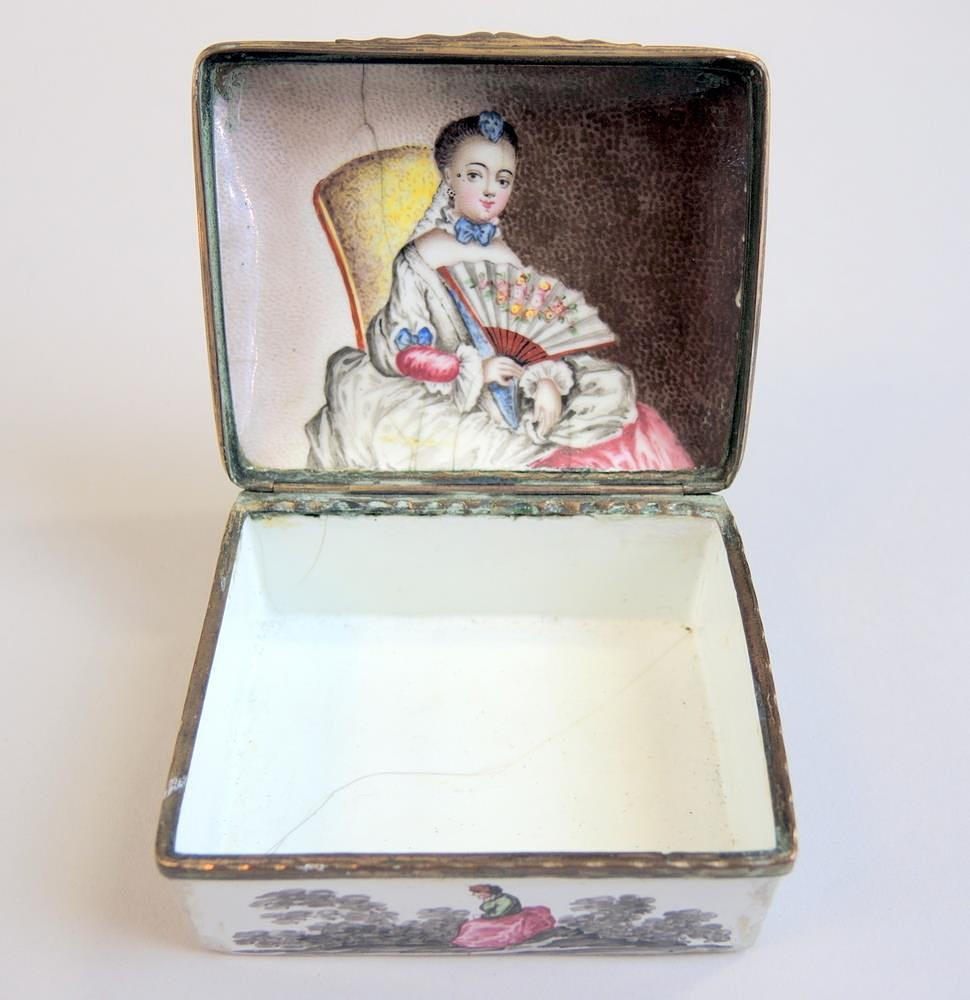 Tabatière, målat porslin med koppar montur (rester av förgyllning), ett förälskat par på locket i Grisaille-landskap, på insidan locket fint porträtt av en adelsdam med en solfjäder, div. sprickor, delvis restaurerat, tysk, 1700 tal, H x B x D ca 4 x 8 x 7 cm.