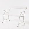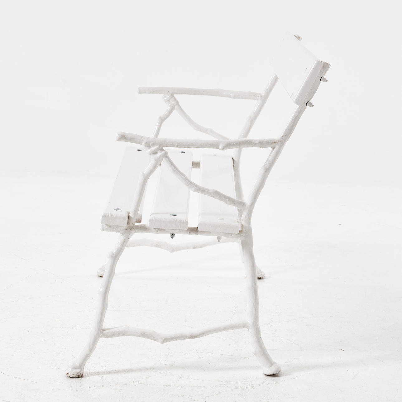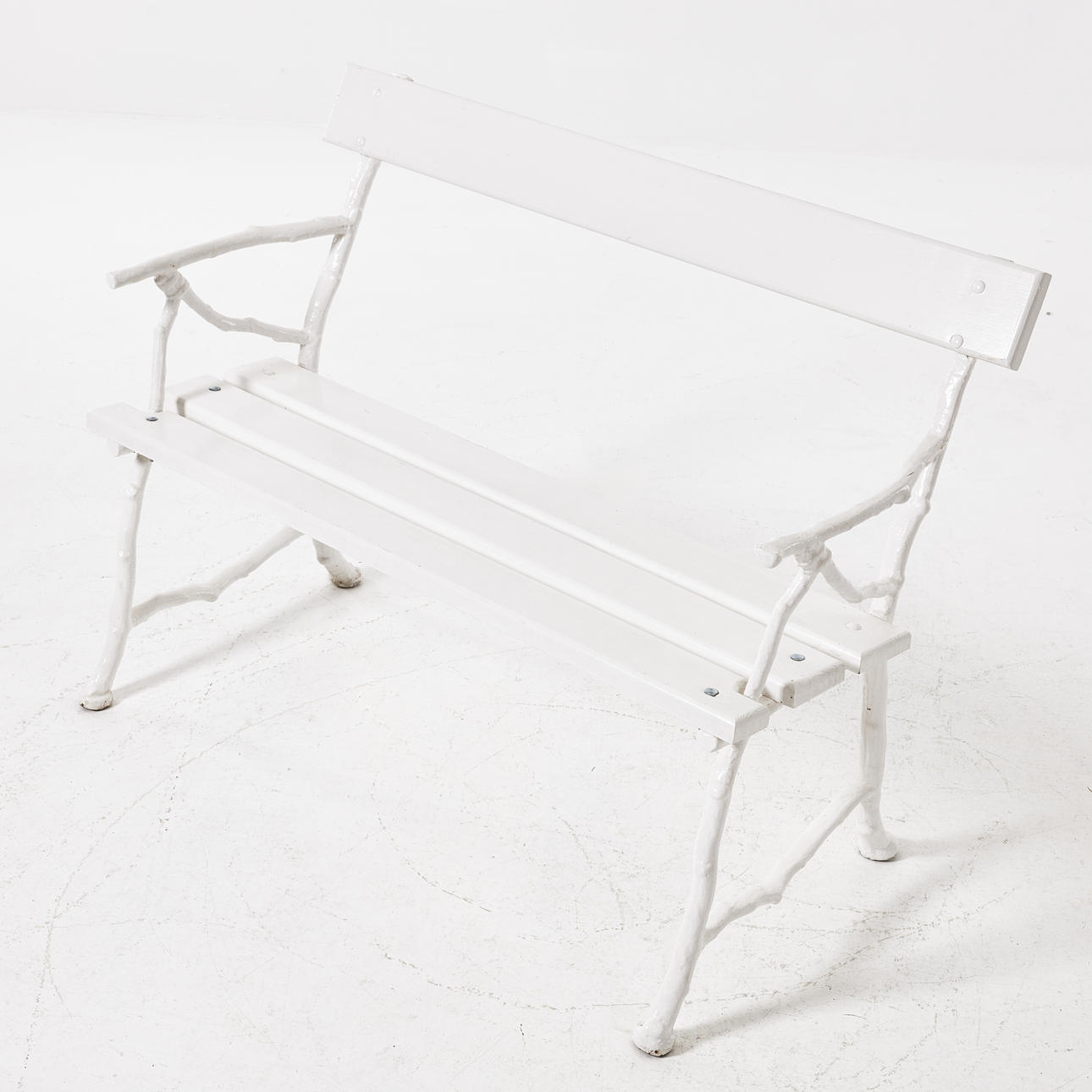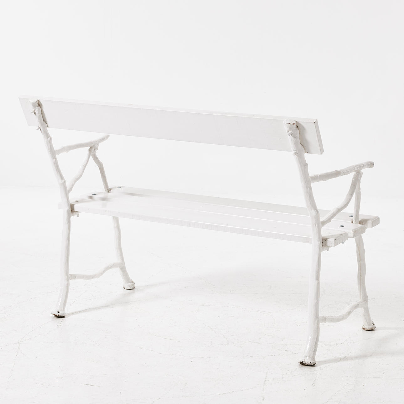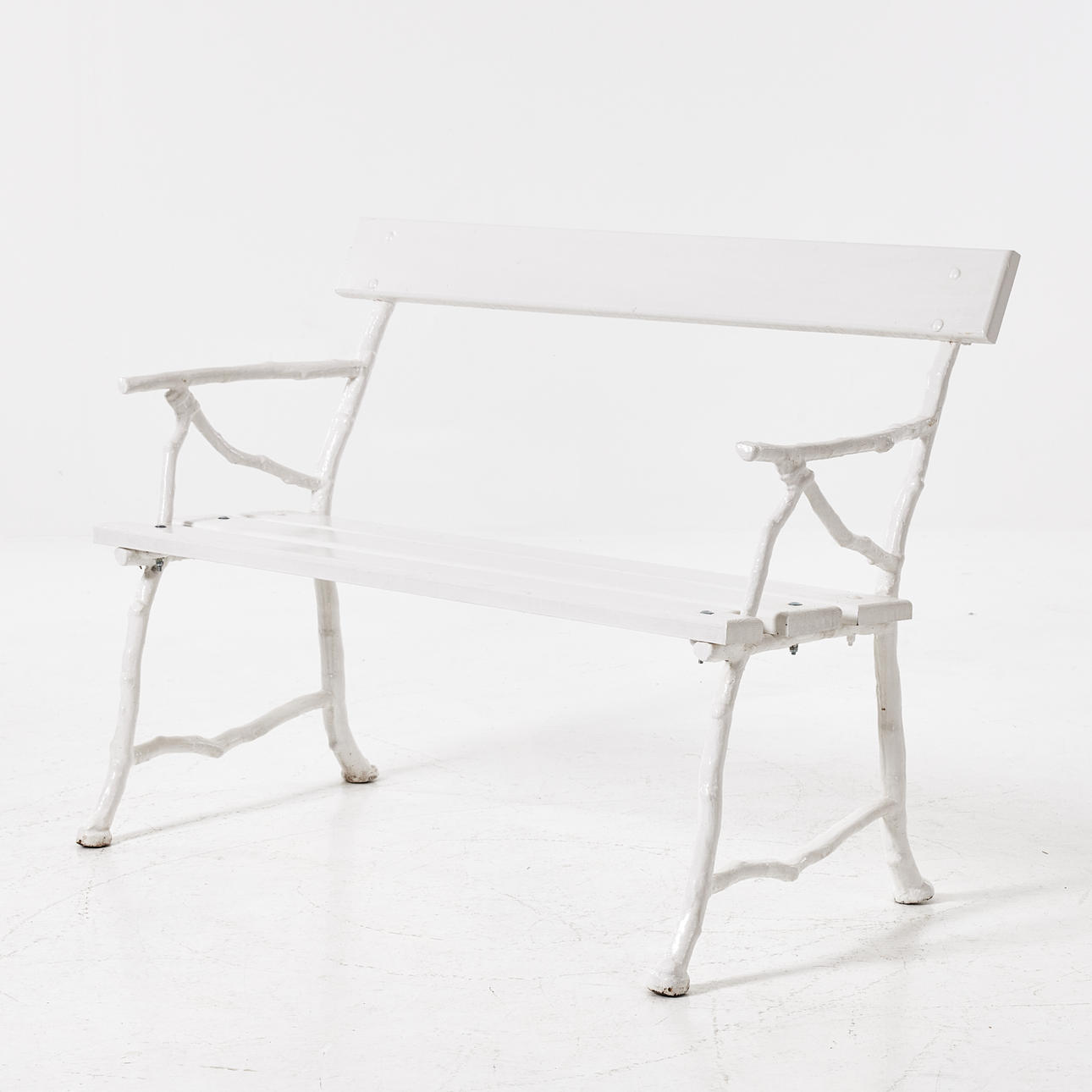 Vitmålad, gjutjärnsstommarna omkring 1900, sitthöjd 43, längd 115, rygghöjd 83 cm.