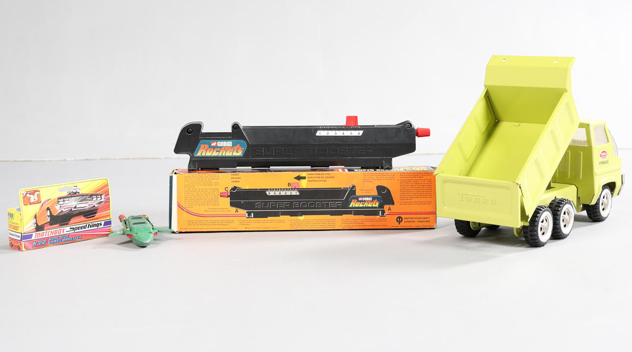 För att inkludera en Dinky Toys Thunderbirds 2, Tonka Hydraulic Dumper, en boxad Corgi Rockets Super Booster No.1970 och en boxad Matchbox Speed Kings King Size K-22 Dodge Dragster. (4).