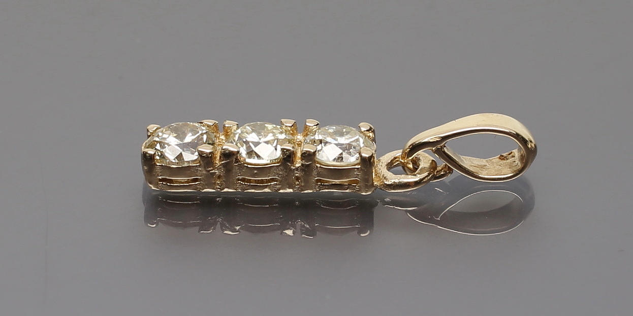 585/000 GG, brutto 1,3 g. Upptagen med tre diamanter, totalvikt. 0,95 ct., Cr / SI. Längd 2,4 cm.