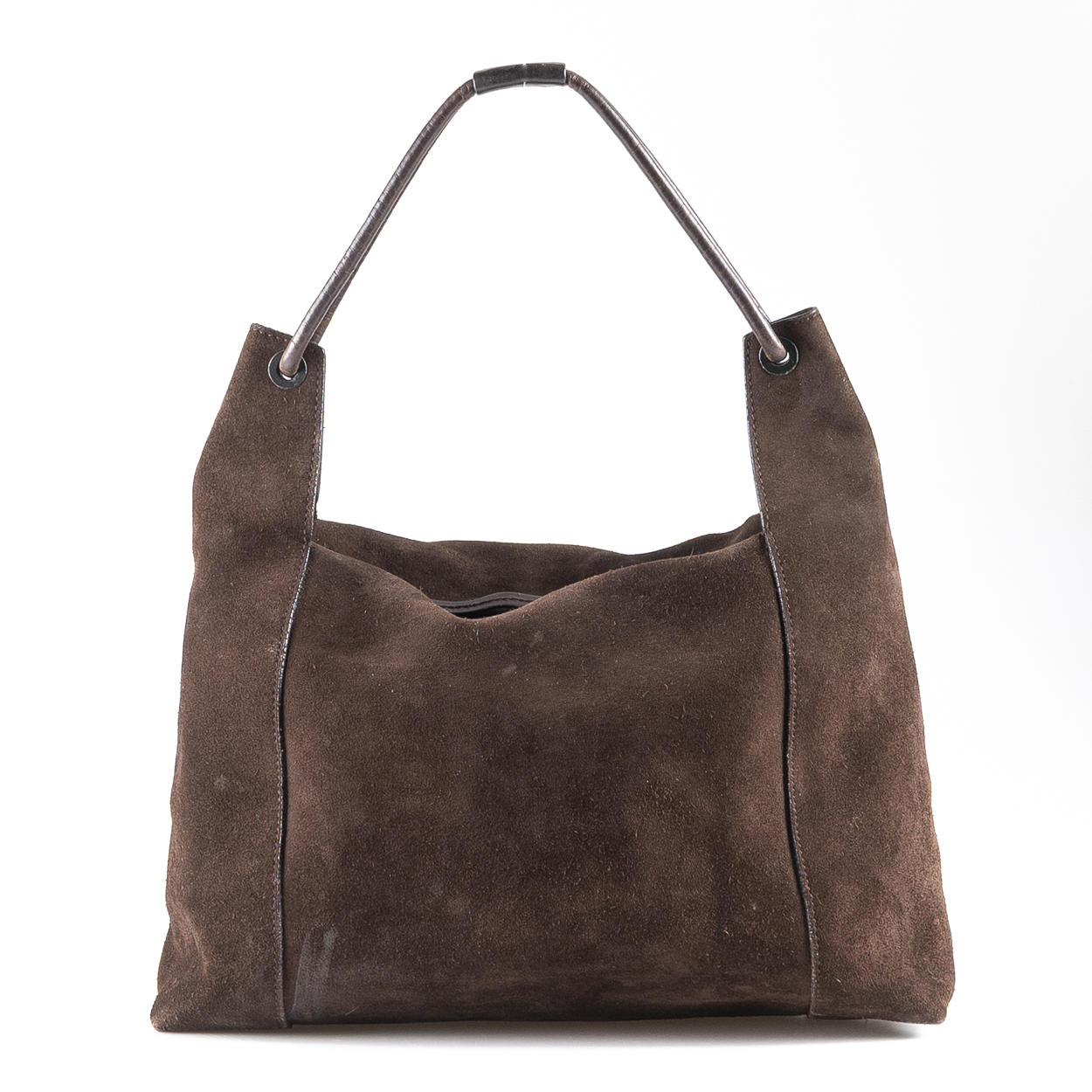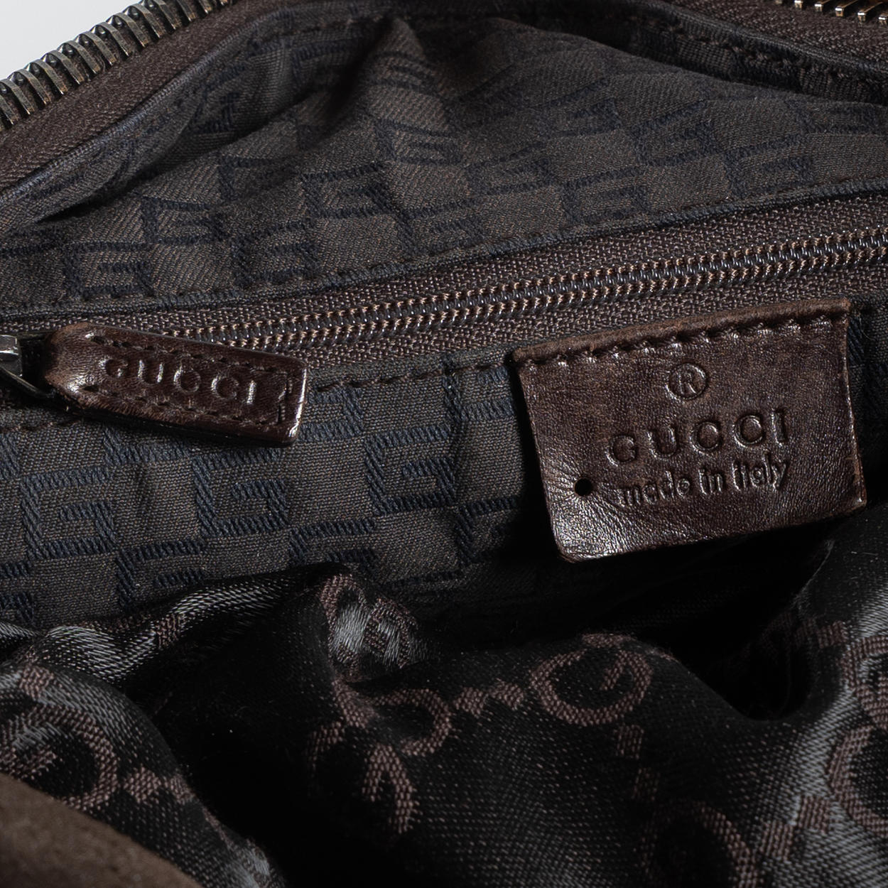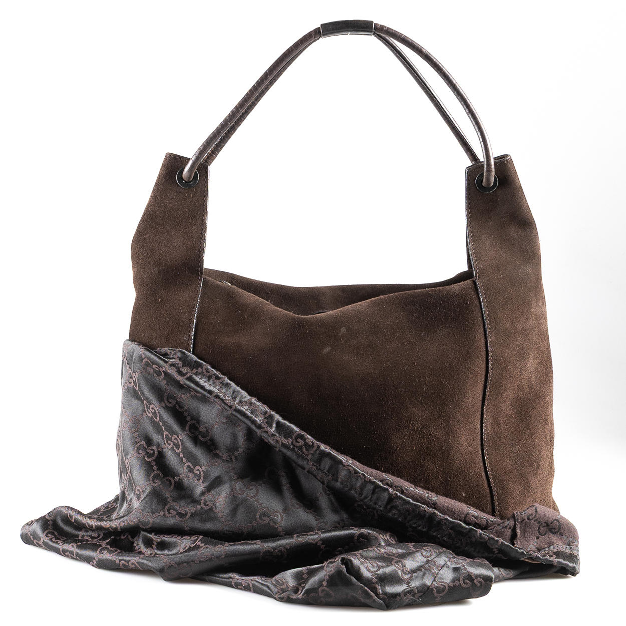 Axelremsväska i brun mocka med axelrem i läder. Blixtlåsförsett huvudfack med inredning i monogramvävd textil ett blixtlåsförsett sidofack. Märkt ® GUCCI, made in Italy, 101292 01998. Dustbag medföljer. Axelrem drop ca 25 cm. Väska ca 38 x 26x13 cm.