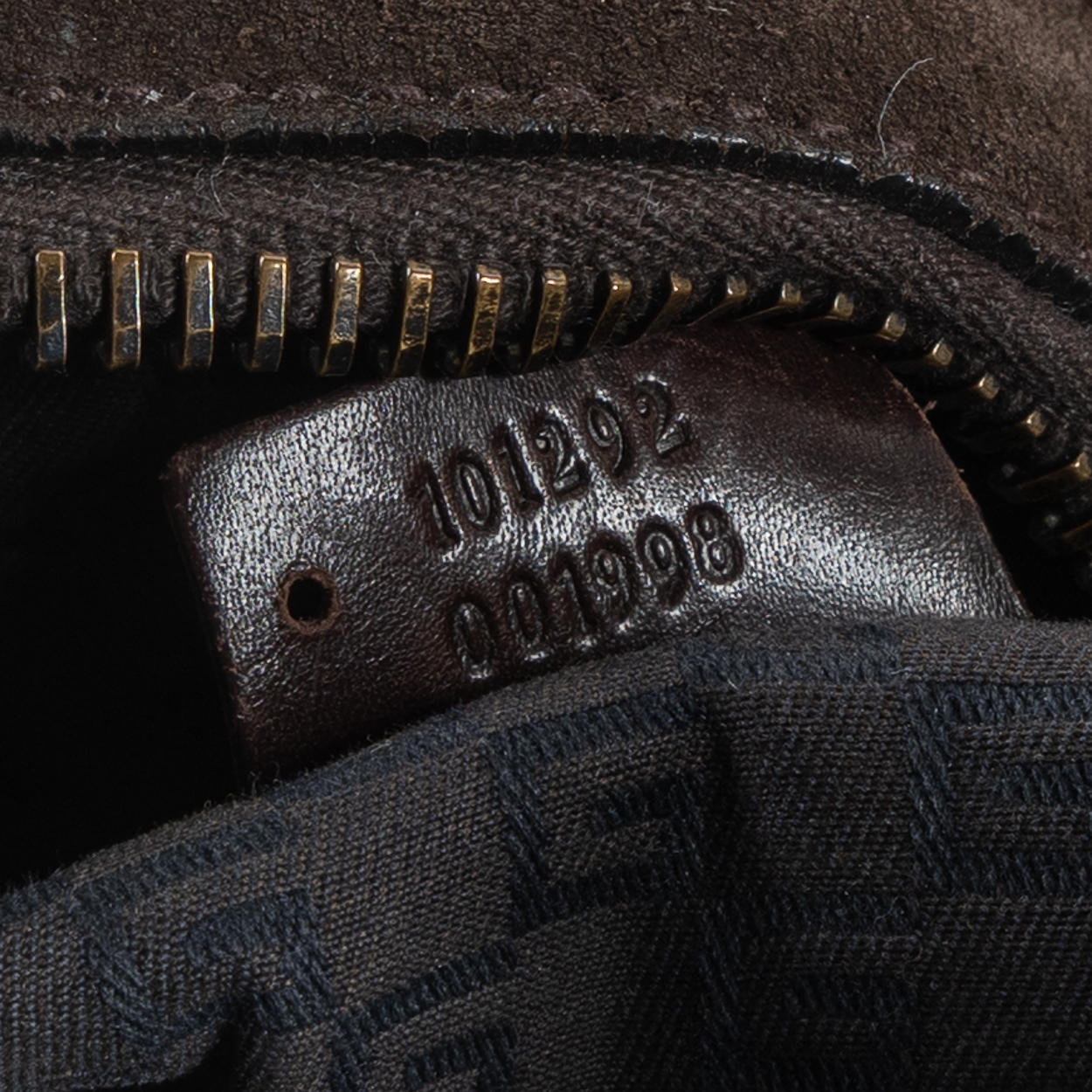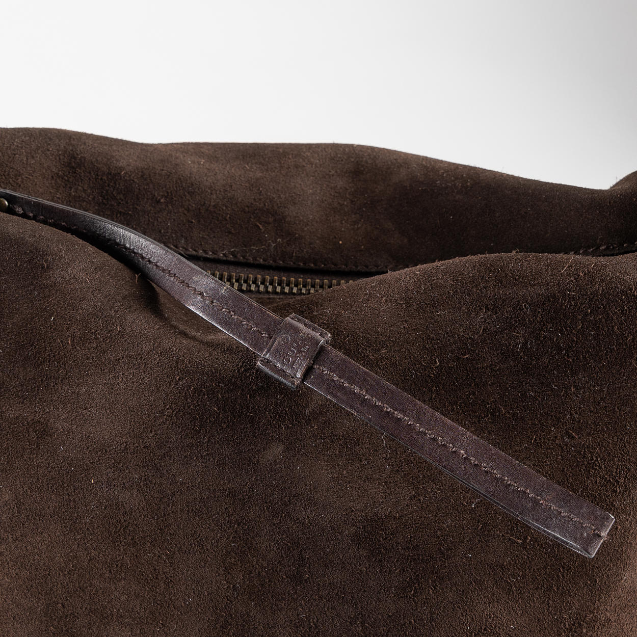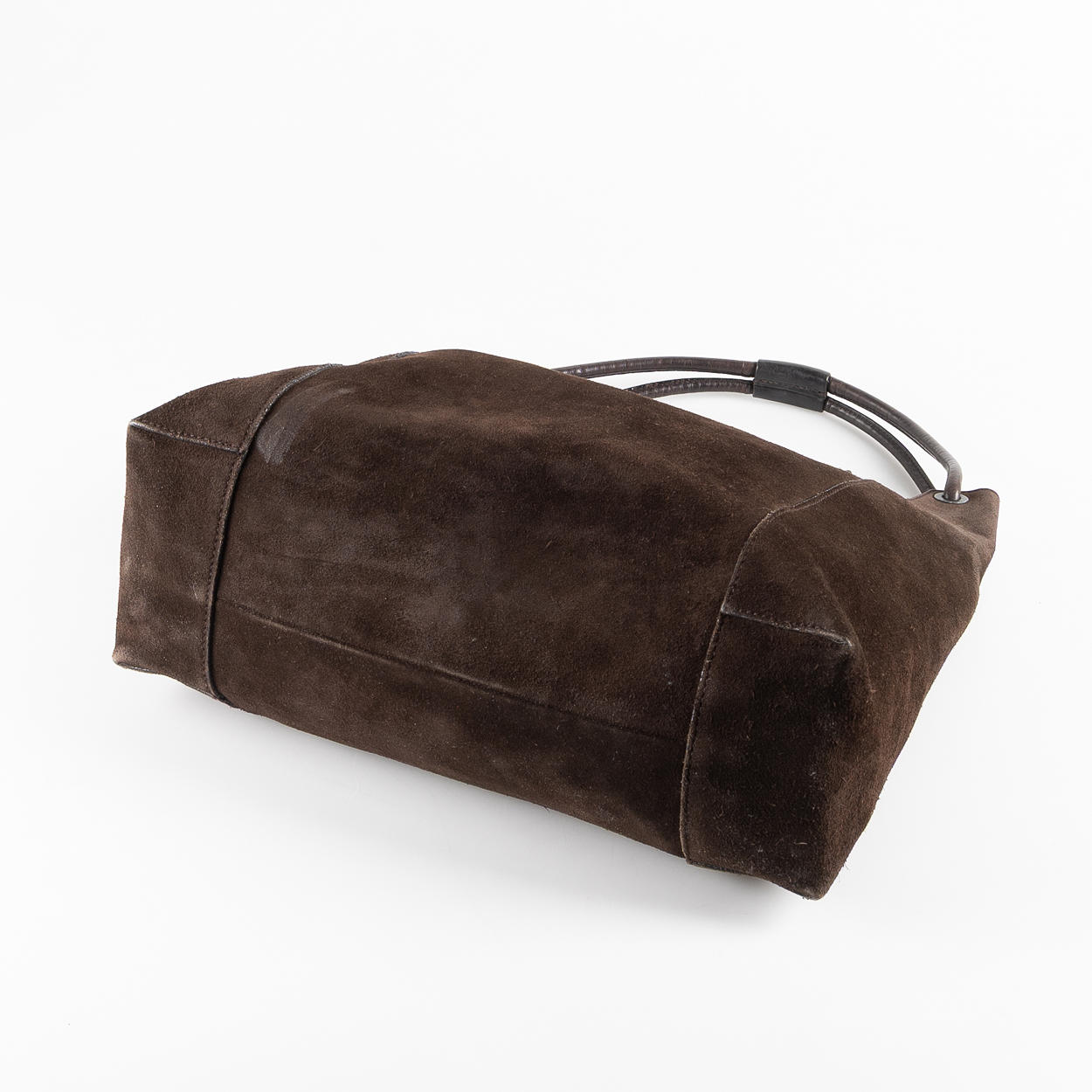 Axelremsväska i brun mocka med axelrem i läder. Blixtlåsförsett huvudfack med inredning i monogramvävd textil ett blixtlåsförsett sidofack. Märkt ® GUCCI, made in Italy, 101292 01998. Dustbag medföljer. Axelrem drop ca 25 cm. Väska ca 38 x 26x13 cm.