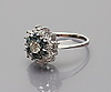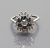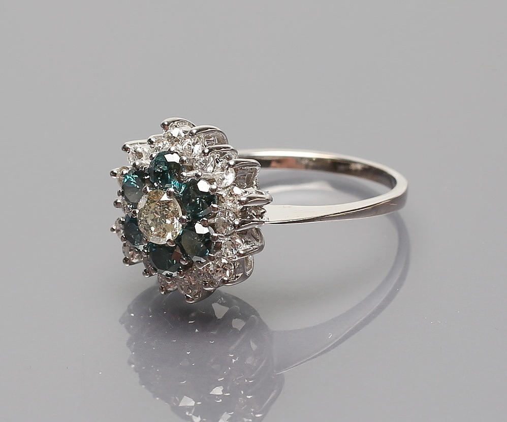 585/000 WG, brutto 5,4 g. Flower-formad ring huvudet set med diamant, ca 0,3 ct., W-TCR / pi, omgiven av sex diamanter blå, (behandlad) / pi och krans av 18 diamanter, tcr / pi. Totalt. 2,2 ct. ringstorlek 57,5.