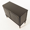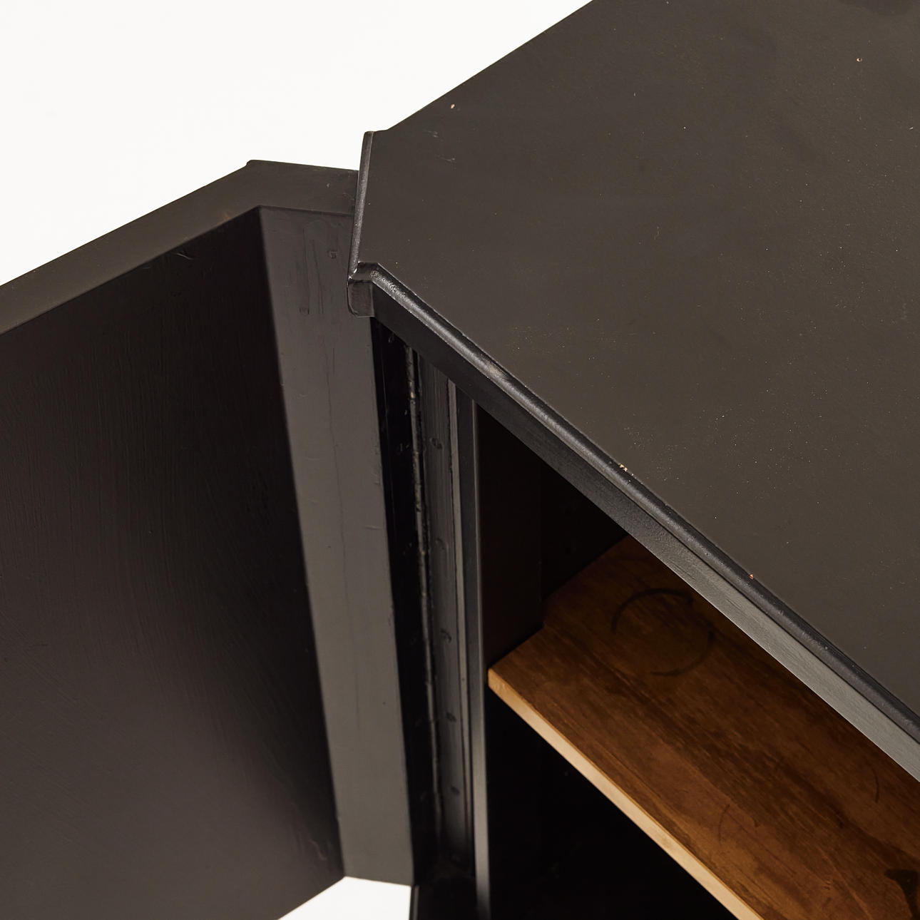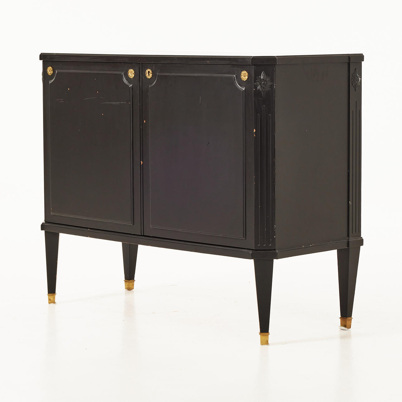 Svartlackerad, invändigt med guldfärg, mått ca 80, 100 x 43 cm.