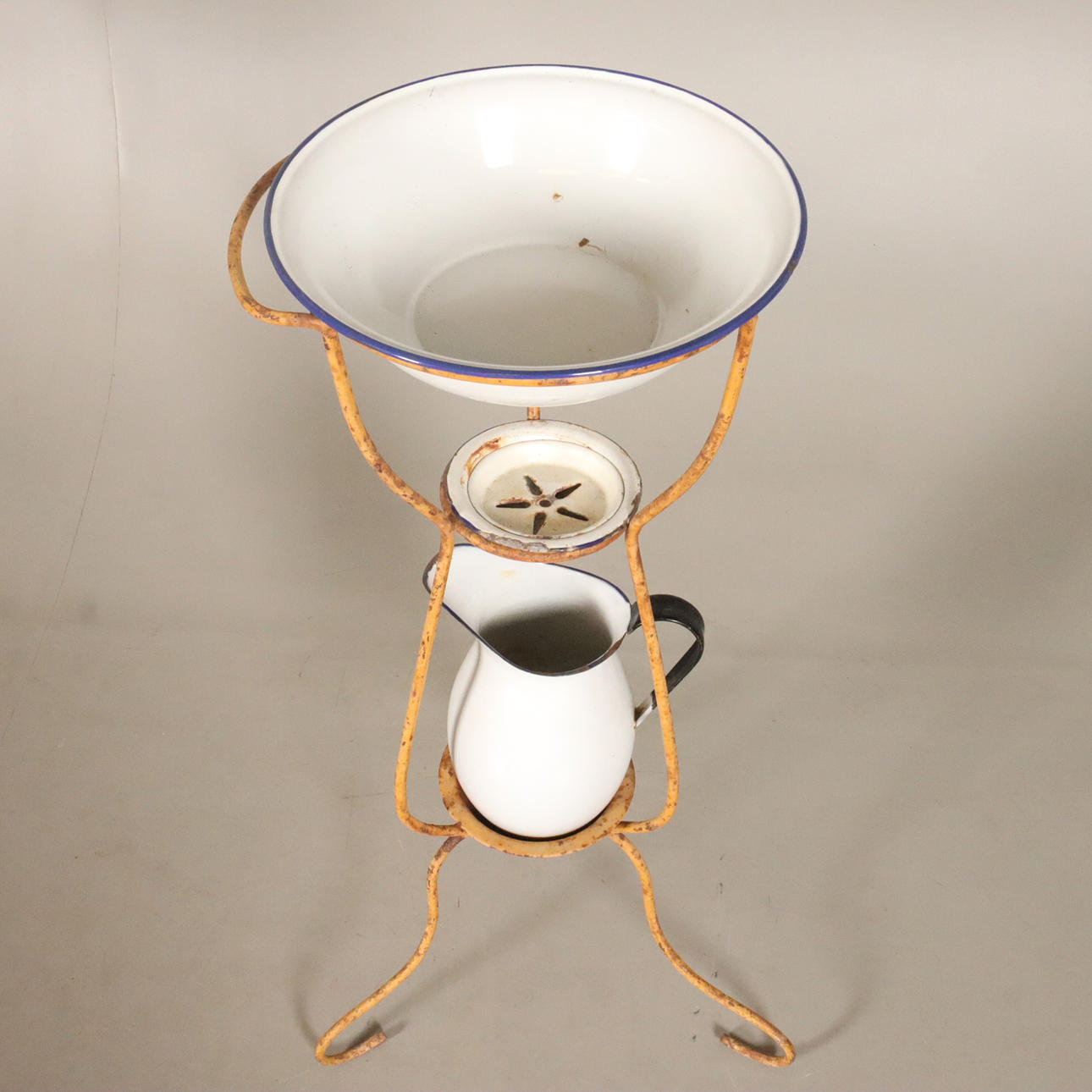 Med kanna och tvålkopp och fat Ställets höjd 82 cm fatets diameter 32 cm.