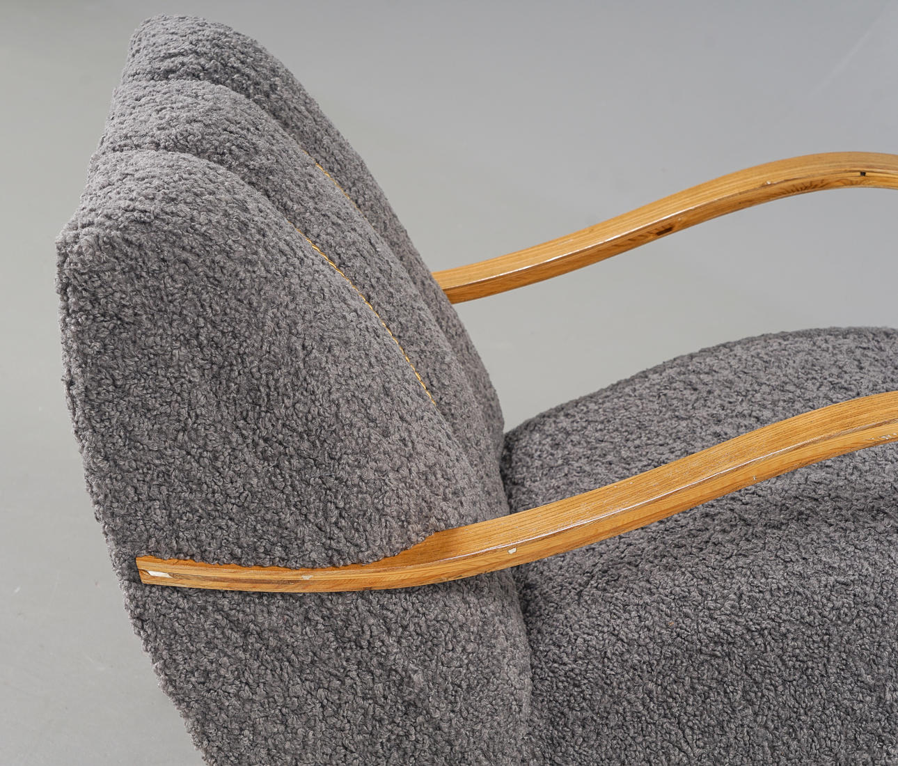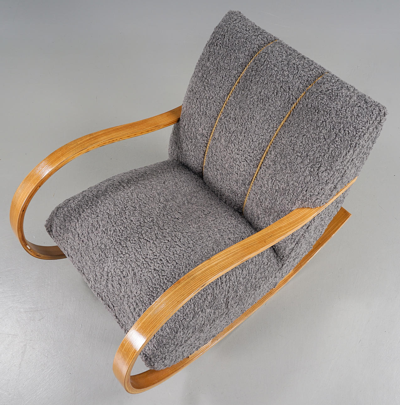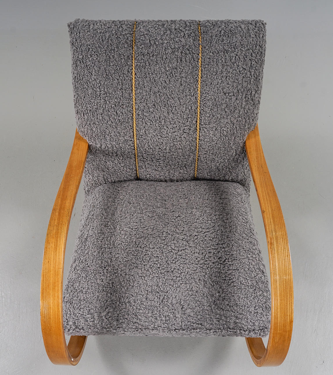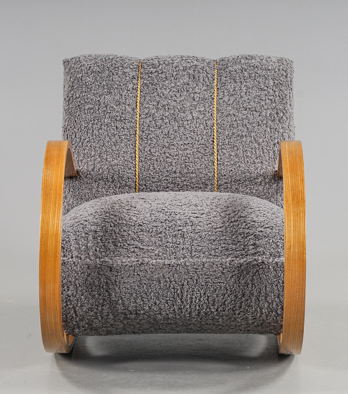 Skiktlimmad och forrmpressad stomme fanerad med alm. Fast stoppad sits och rygg, klädd med fårskinnsimitation. Guldfärgade dekorbamd. Nyrenoverad och omklädd.