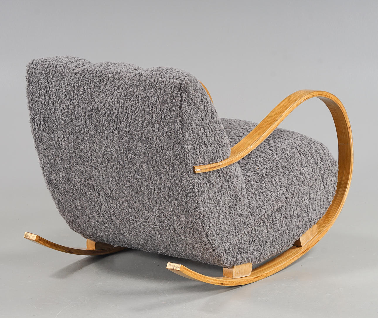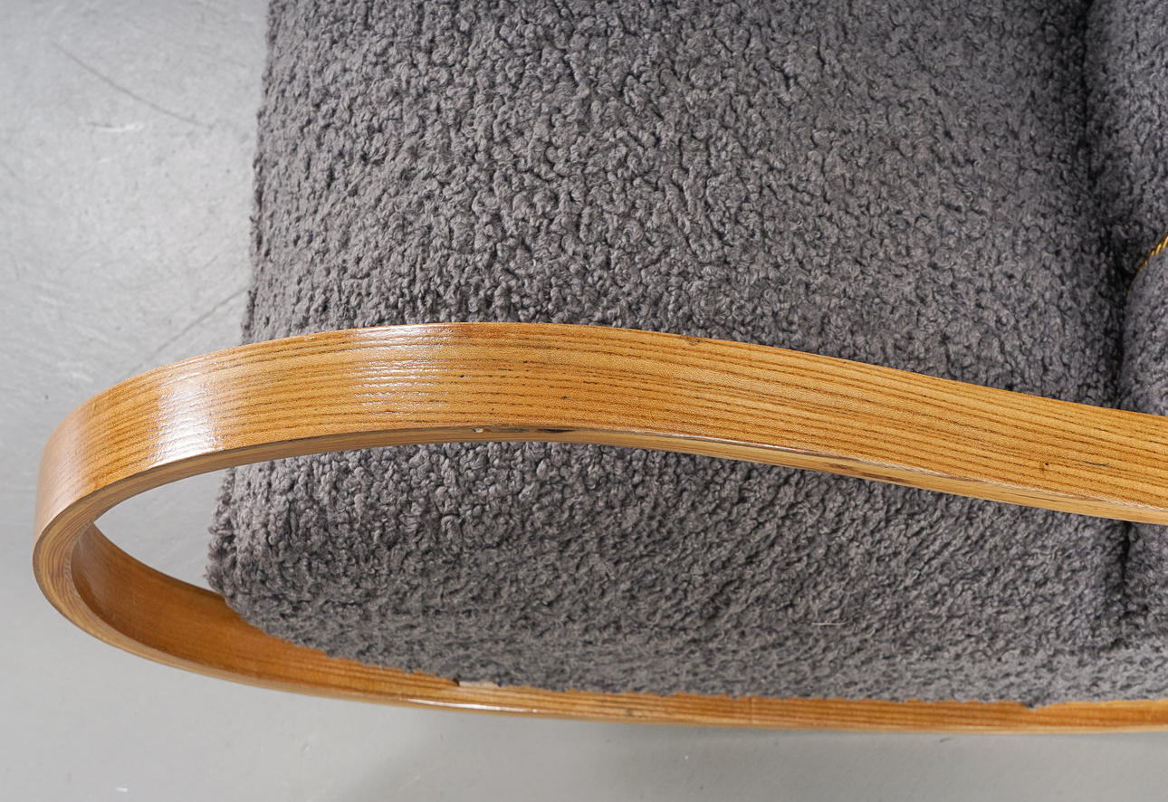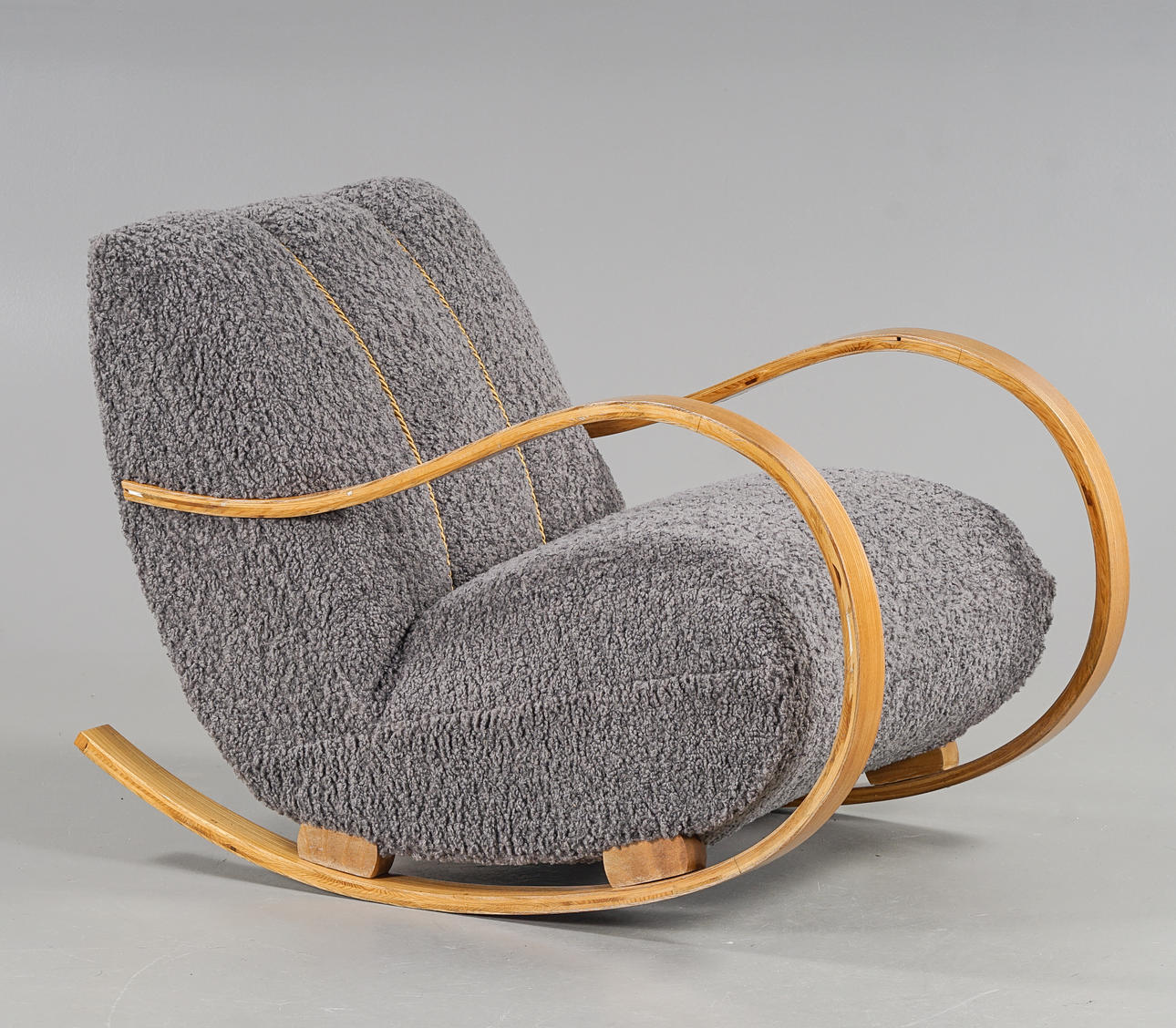 Skiktlimmad och forrmpressad stomme fanerad med alm. Fast stoppad sits och rygg, klädd med fårskinnsimitation. Guldfärgade dekorbamd. Nyrenoverad och omklädd.