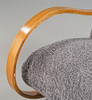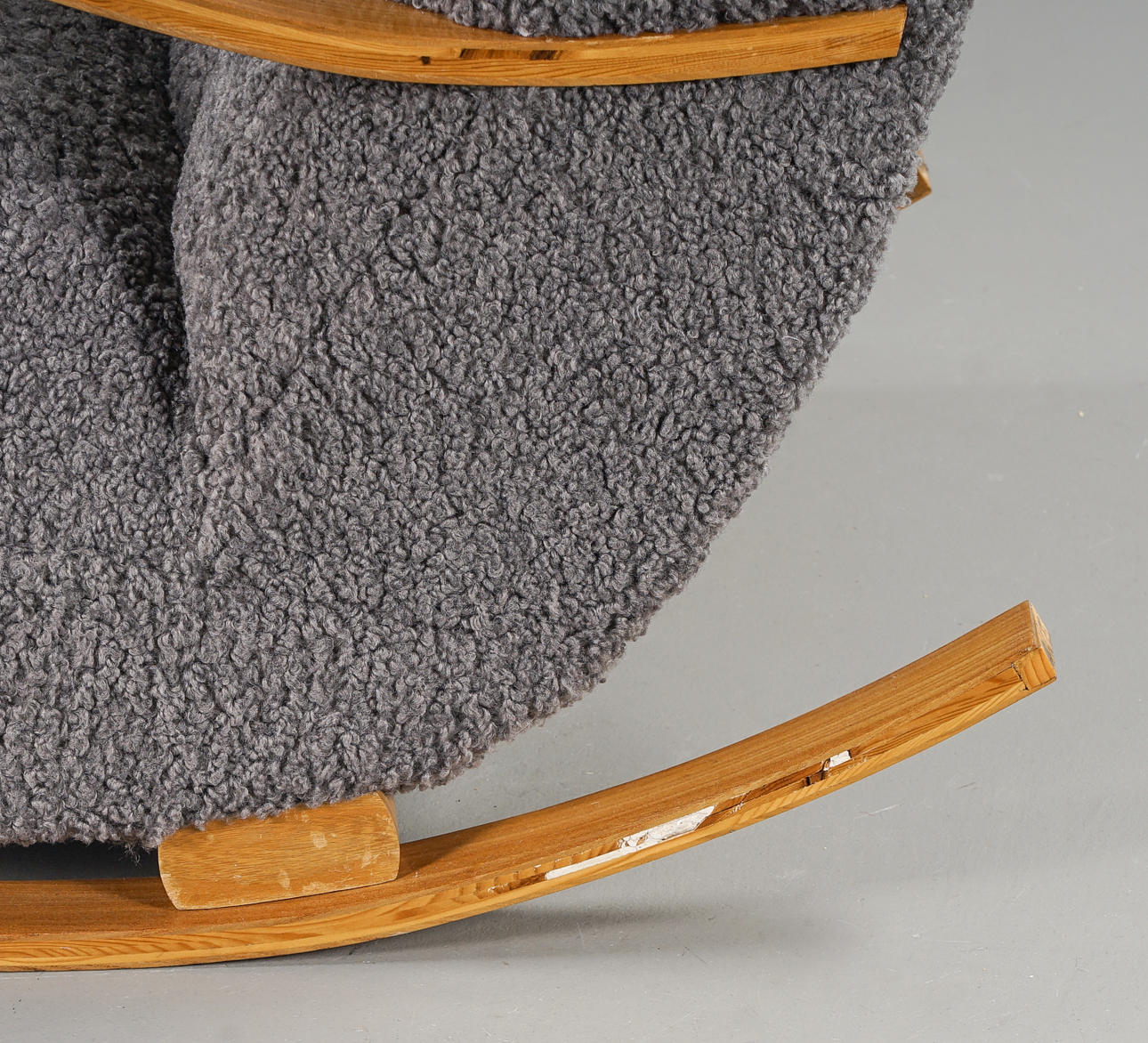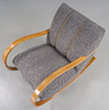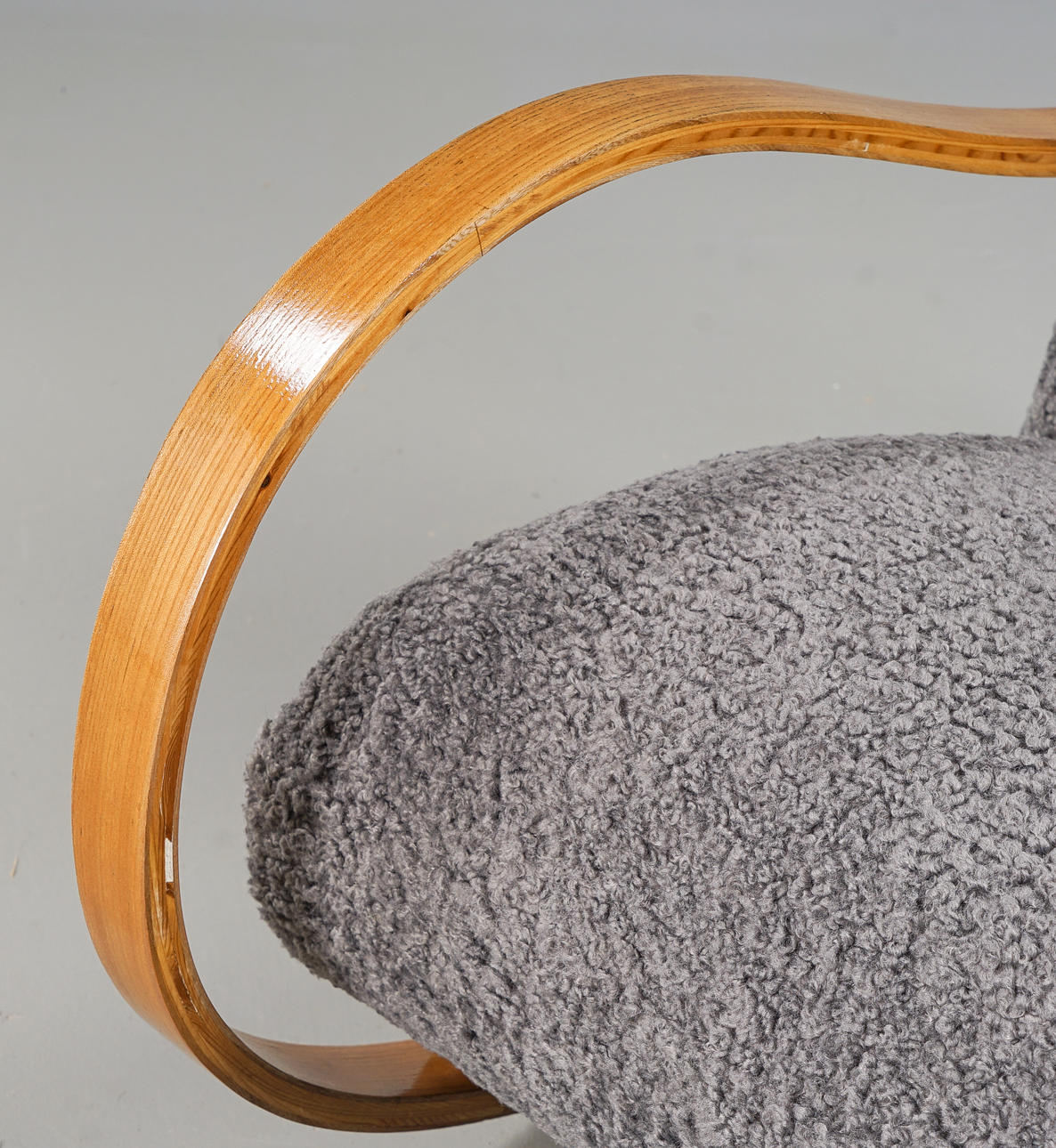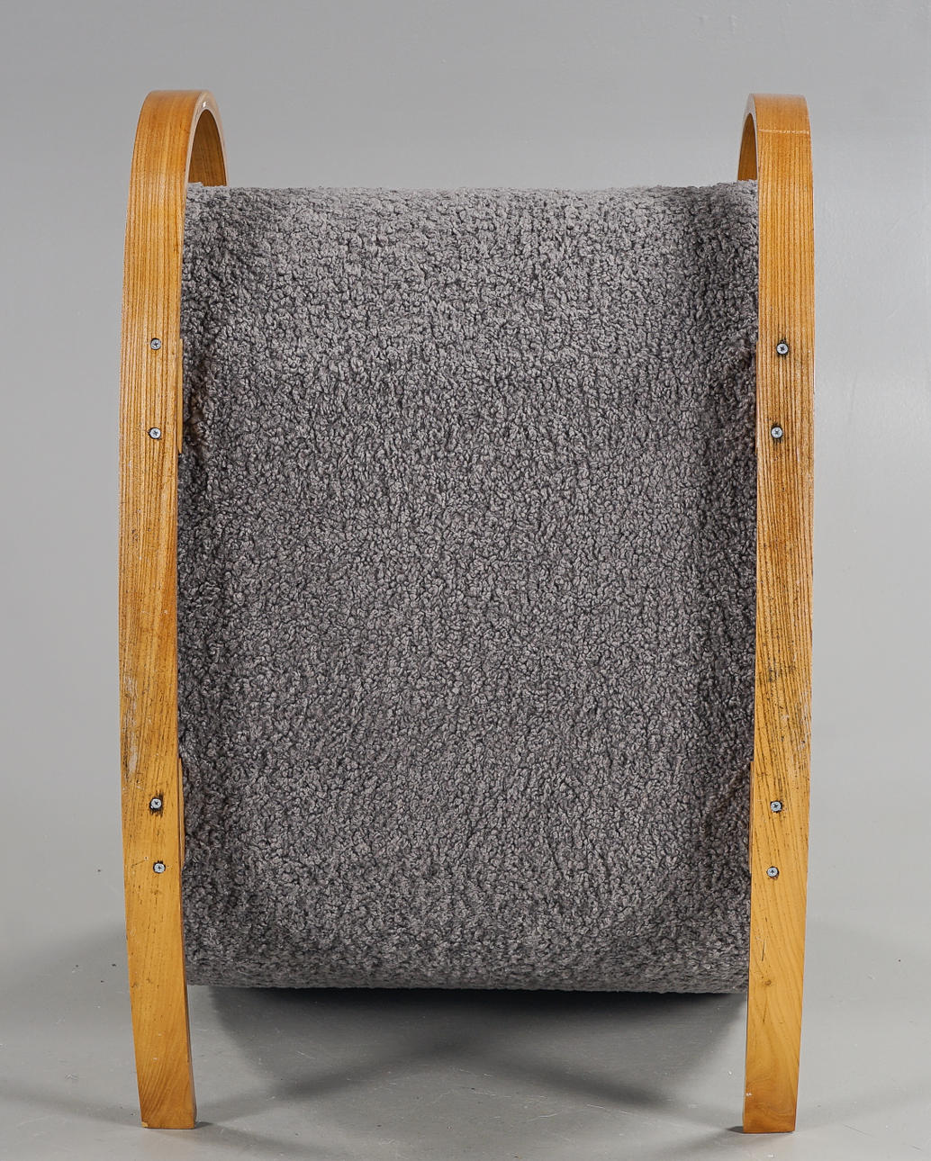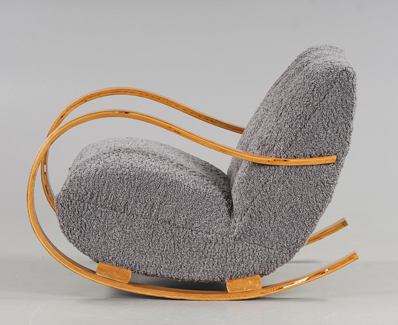 Skiktlimmad och forrmpressad stomme fanerad med alm. Fast stoppad sits och rygg, klädd med fårskinnsimitation. Guldfärgade dekorbamd. Nyrenoverad och omklädd.