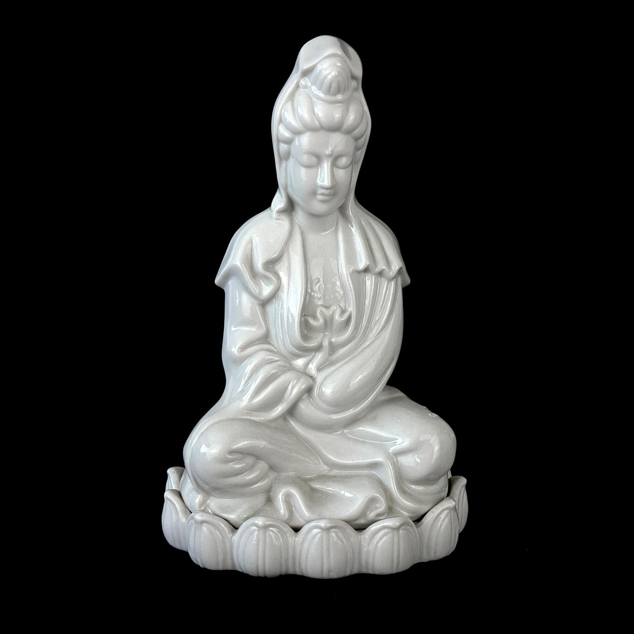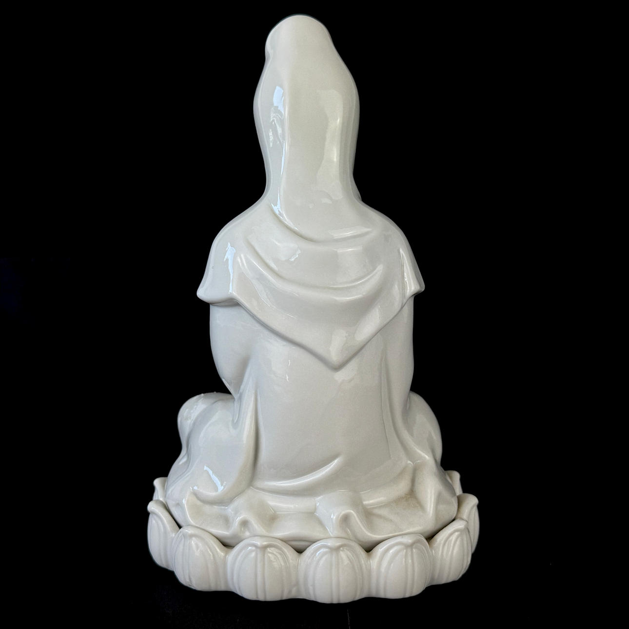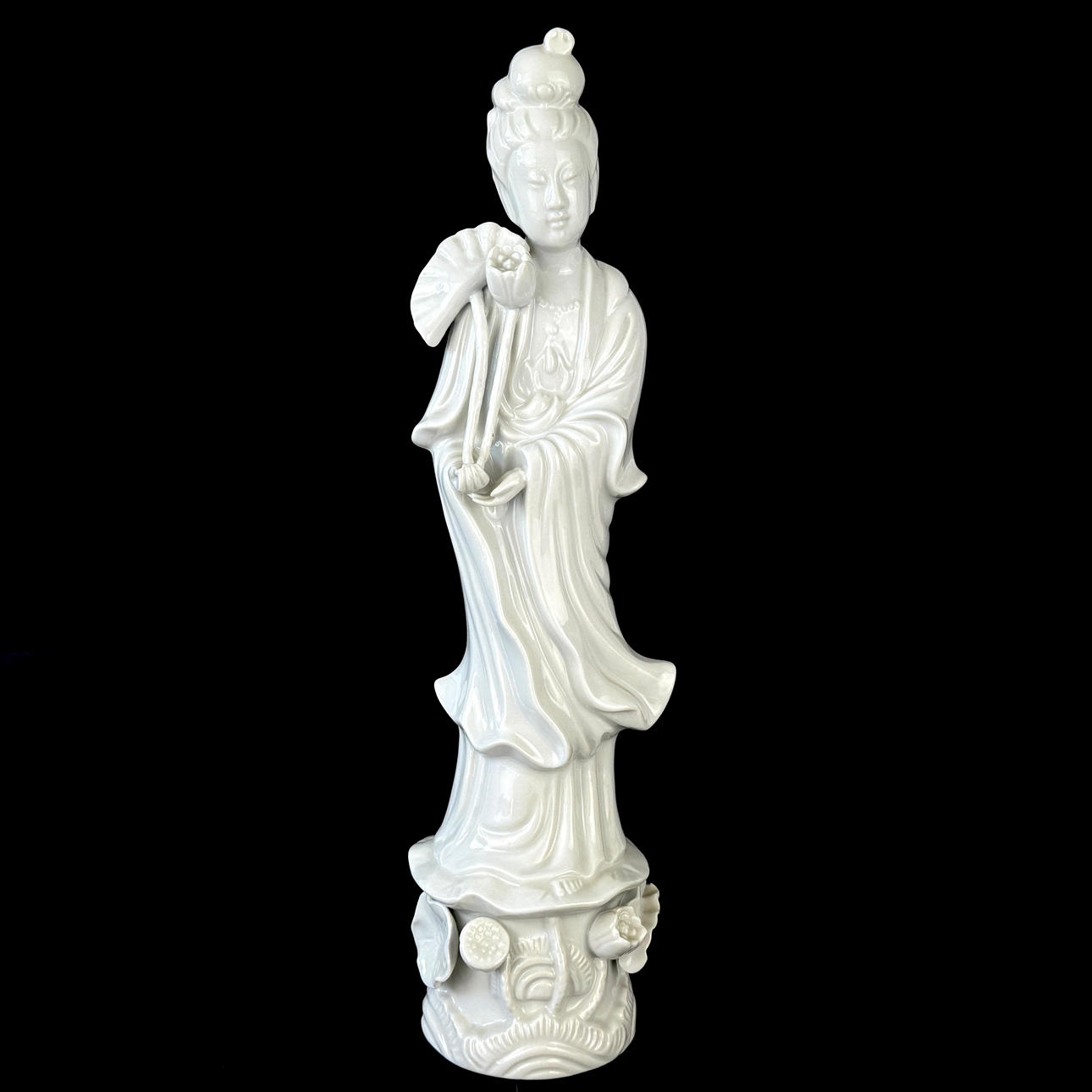En stor kinesisk Blanc De Chine porslinsfigur av Guanyin stående, H. 37cm. Tillsammans med en liknande sittande figur.