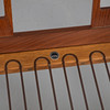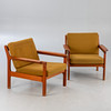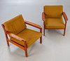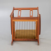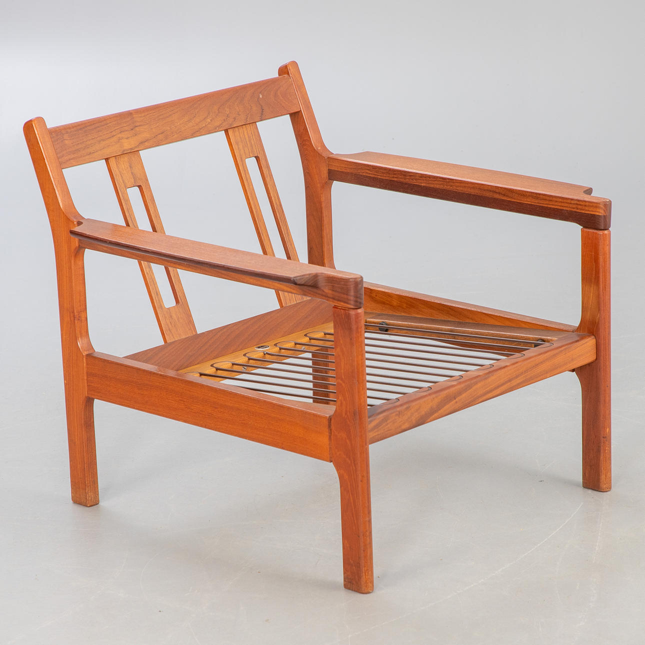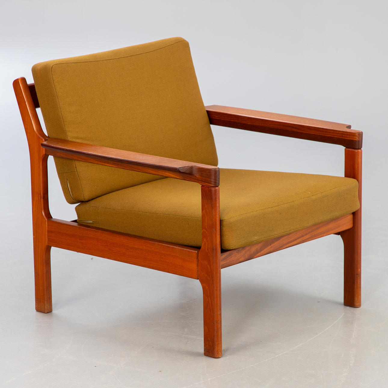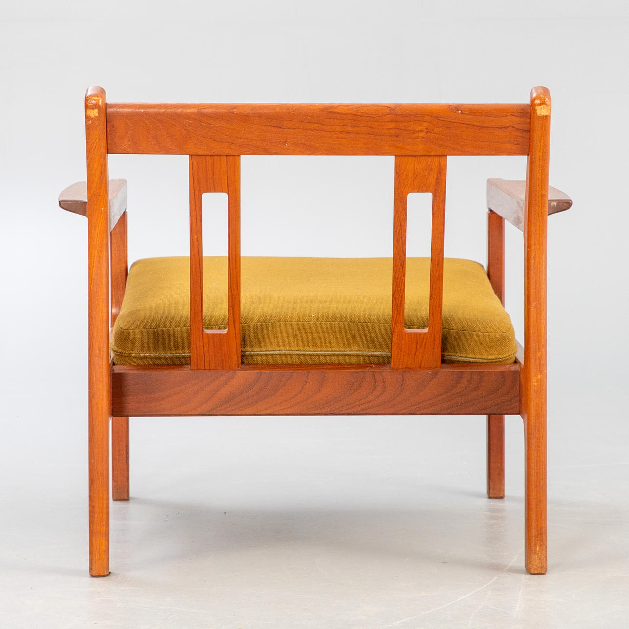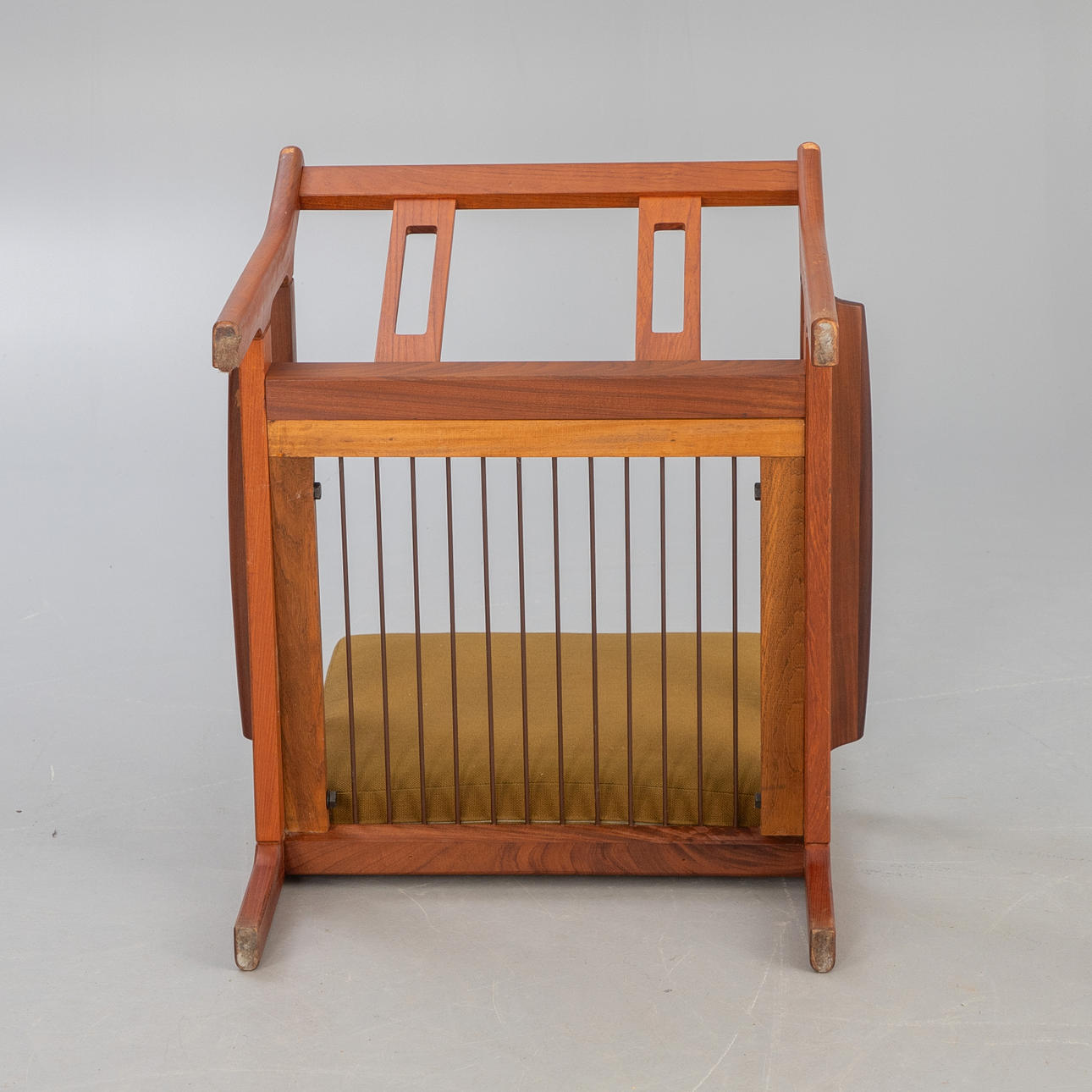 Teakträ, lösa kuddar med grönt ulltyg.