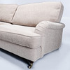 Fast tygklädsel, lös sittdyna. Mörkbetsade ben bak och hjul framtill