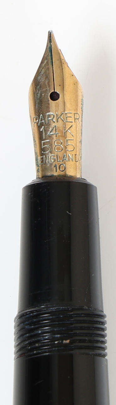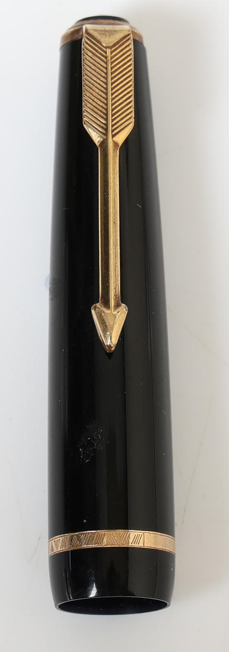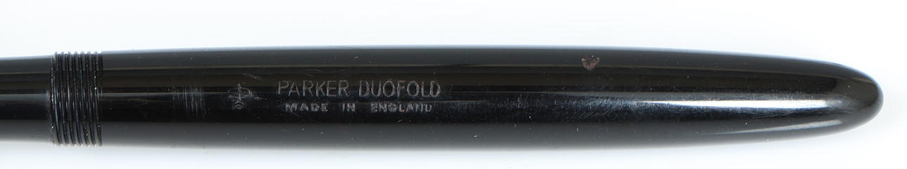 Med glänsande jetsvart fat, guldfylld kant, Parker pilfickklämma, mönstrat band till locket, den torpedformade pipan med texten ”Parker Duofold Made in England”, aeromatic filler, 14kt guld med texten ”Parker 14ct 585 England 10", 13,5 cm lång.
