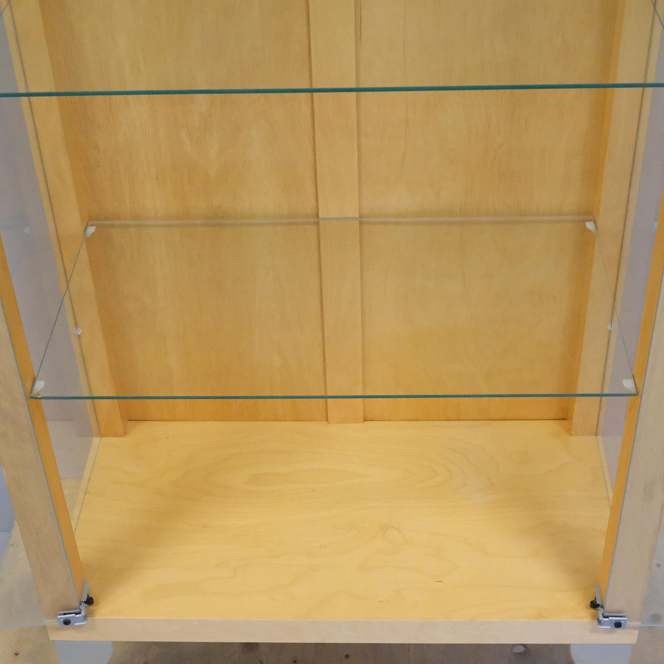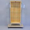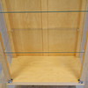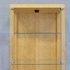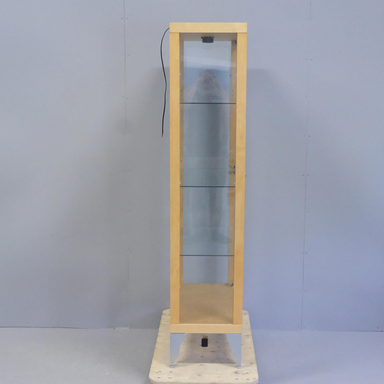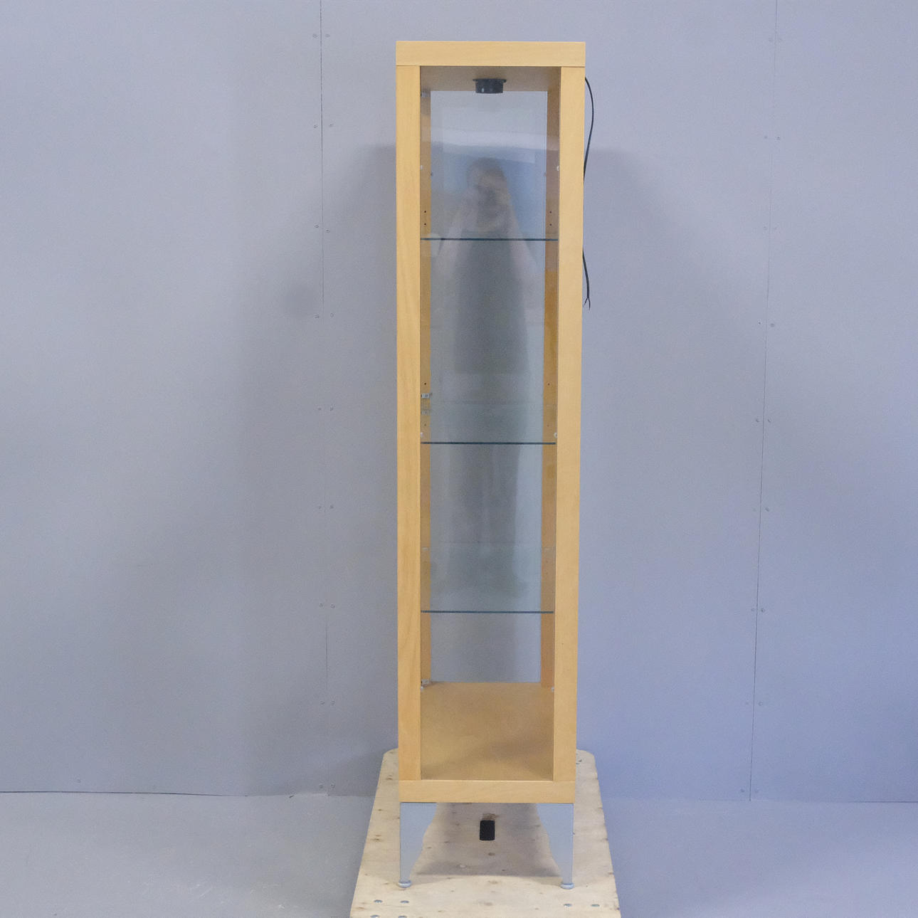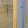 Björkfolie. Ben av lackerat stål. Glasväggar, glasdörrar samt tre glashyllor. Spotlight i taket.