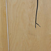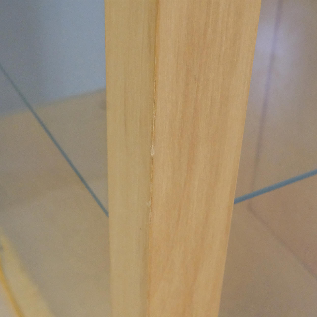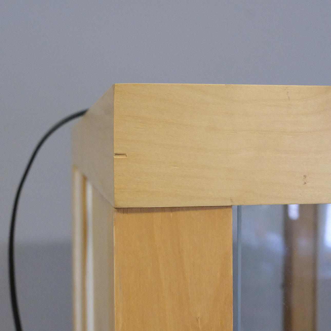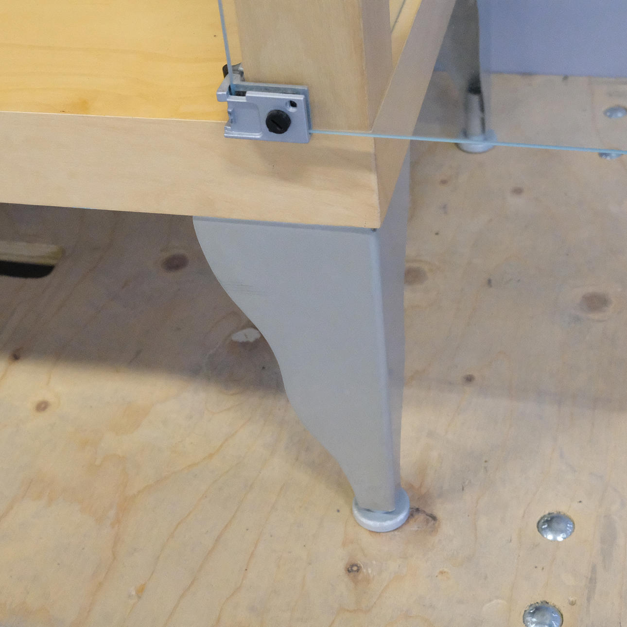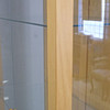 Björkfolie. Ben av lackerat stål. Glasväggar, glasdörrar samt tre glashyllor. Spotlight i taket.