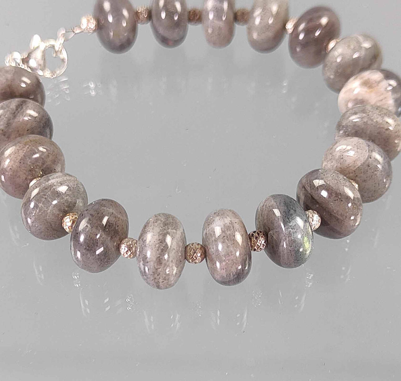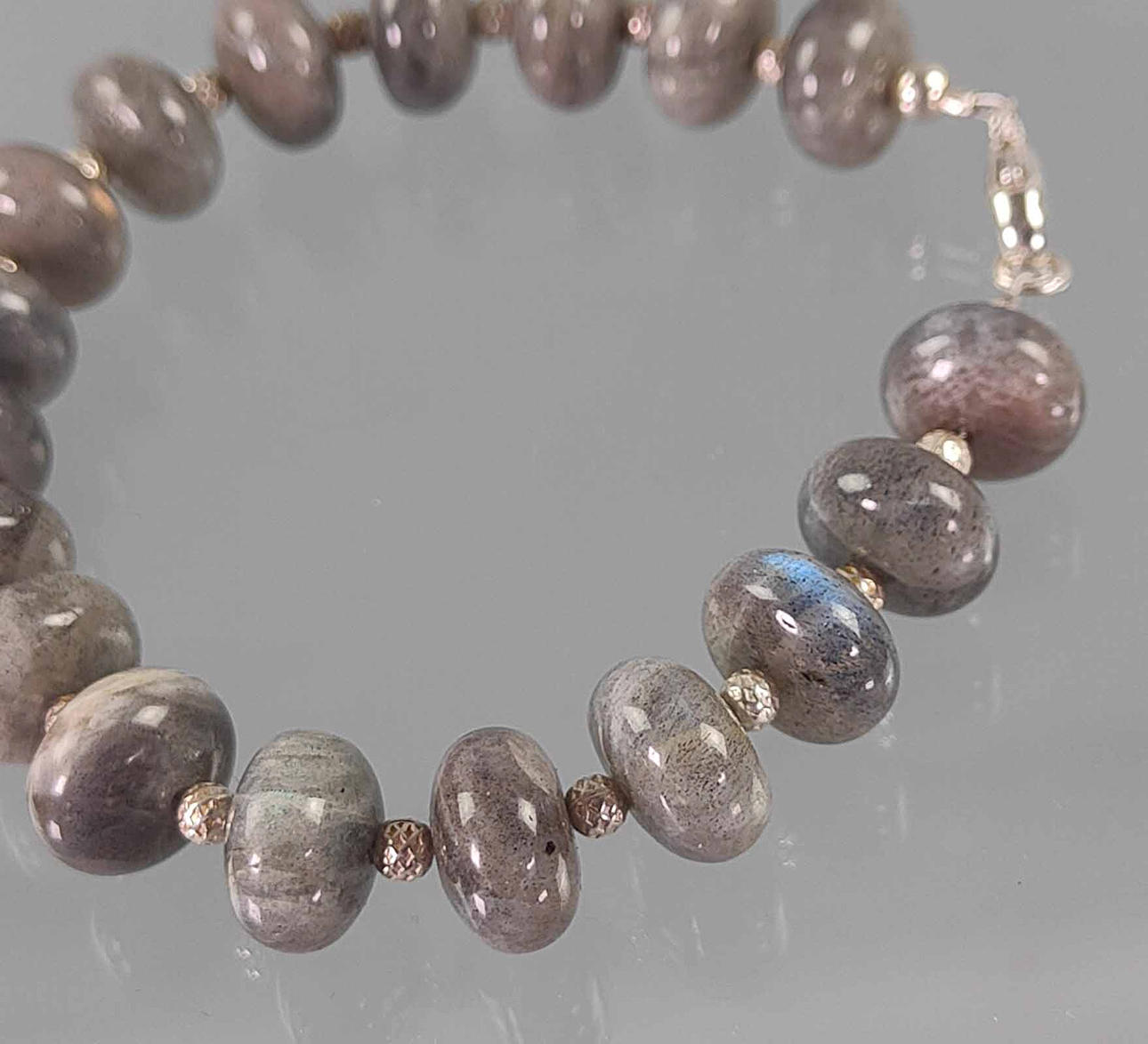 Labradorit 925 silver armband, polerade labradoritrondeller, små silverbollar däremellan, karbinhake - 925 silverlås, längd 21 cm.