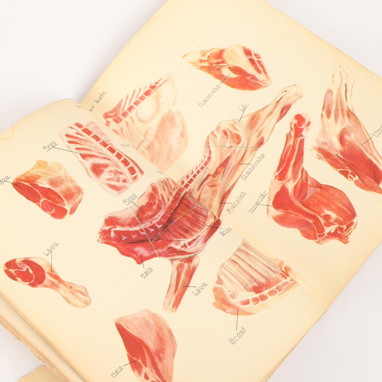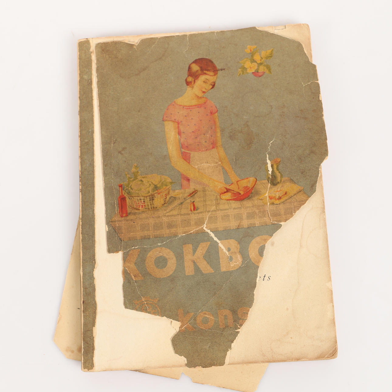 Bruksskick, smärre ytslitage, blekta ryggar, namnade, Konsums "Kokbok", med skador och fläckar.