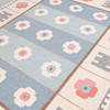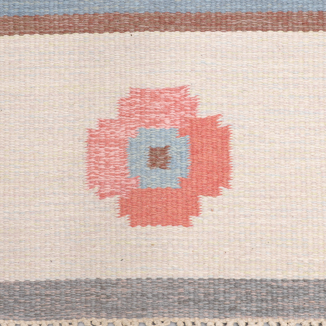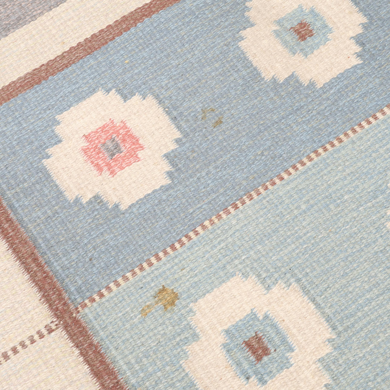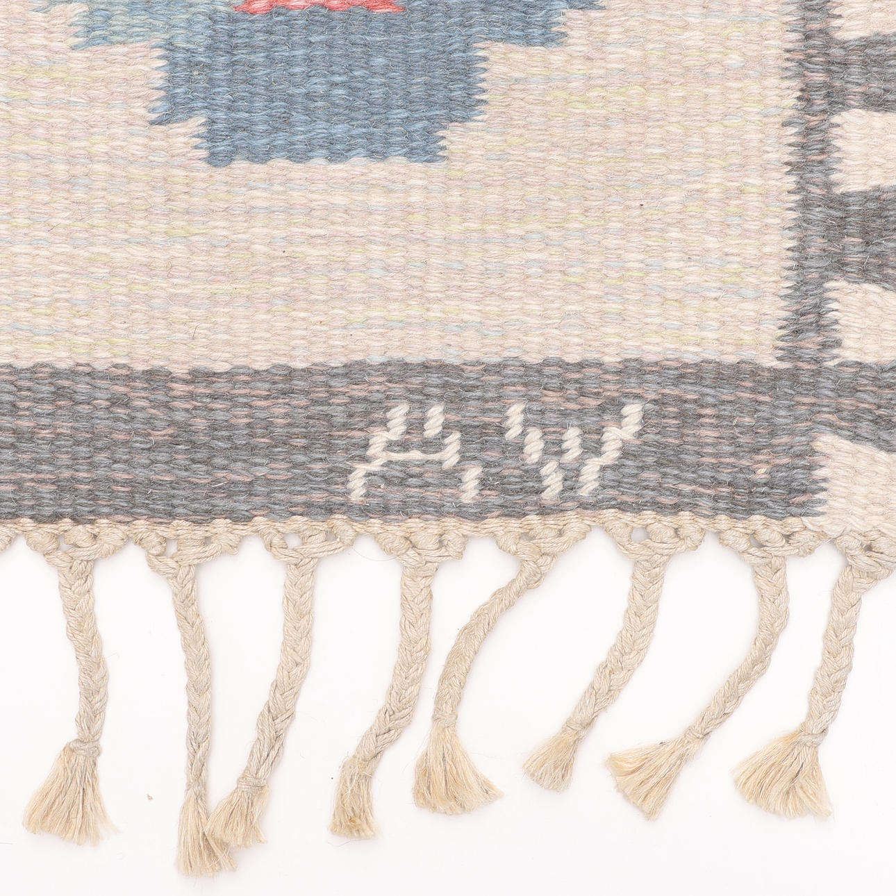 Geometriskt mönster i blått, violett och rött, märkt "AW", ca 235x170 cm.