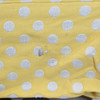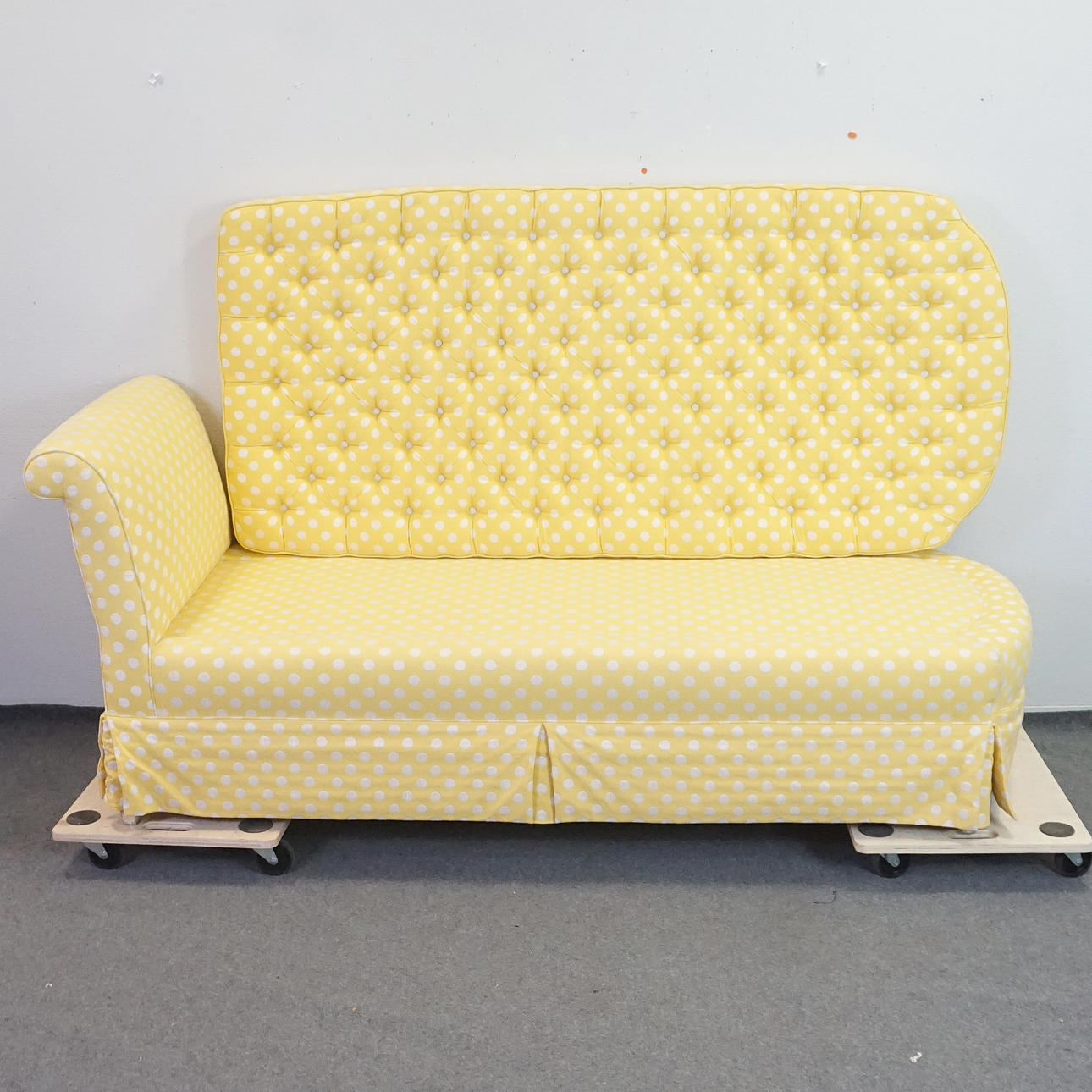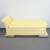 Schäslong med vitmålad trästomme med spiralbotten, 1900-tal. Senare omklädd & renoverad. Klädd i mönstrad, djuphäftad textilklädsel i gult och vitt. Bredd ca 190 cm, djup ca 80 cm, höjd ca 76 cm.