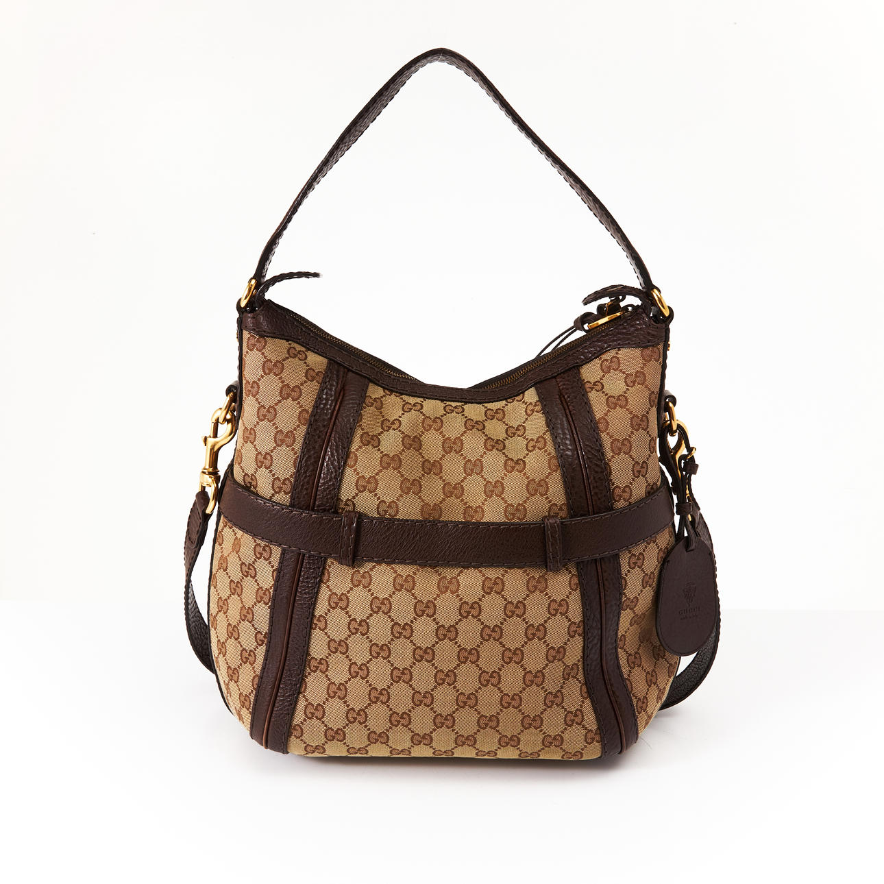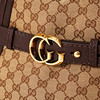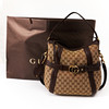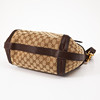 I monogramcanvas med detaljer i brunt präglat skinn, avtagbar axelrem, dragkedja och monogram framtill i gulmetall, med adresstag, fodrad i beige canvas, invändigt med tre fickor varav en med dragkedja, märkt "Gucci made in Italy", medföljande dustbag, kartong, snöre och butikspåse, mått ca 35 x 34 x 16 cm.