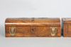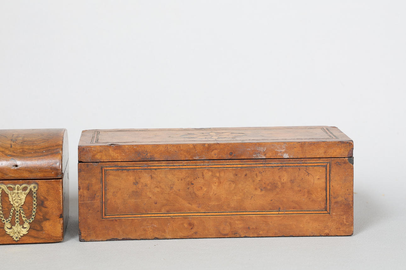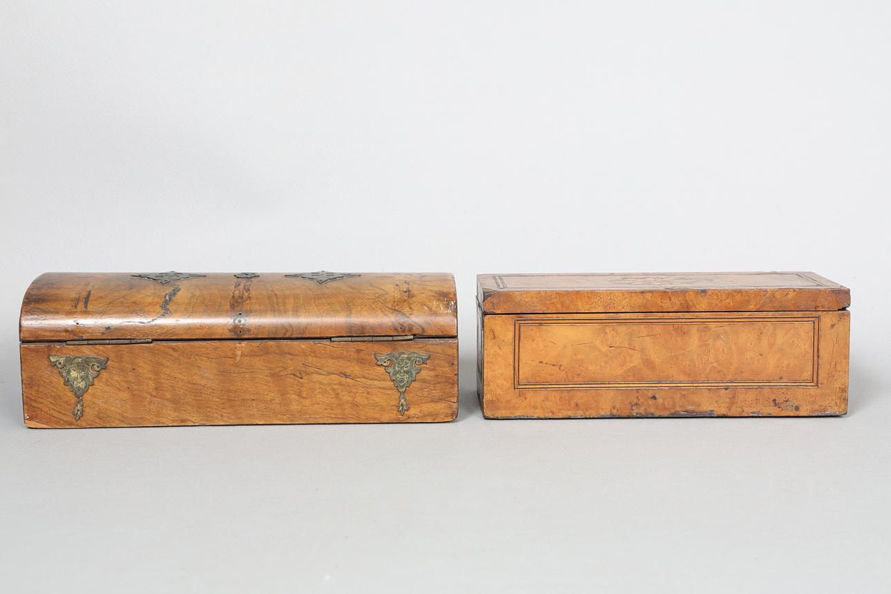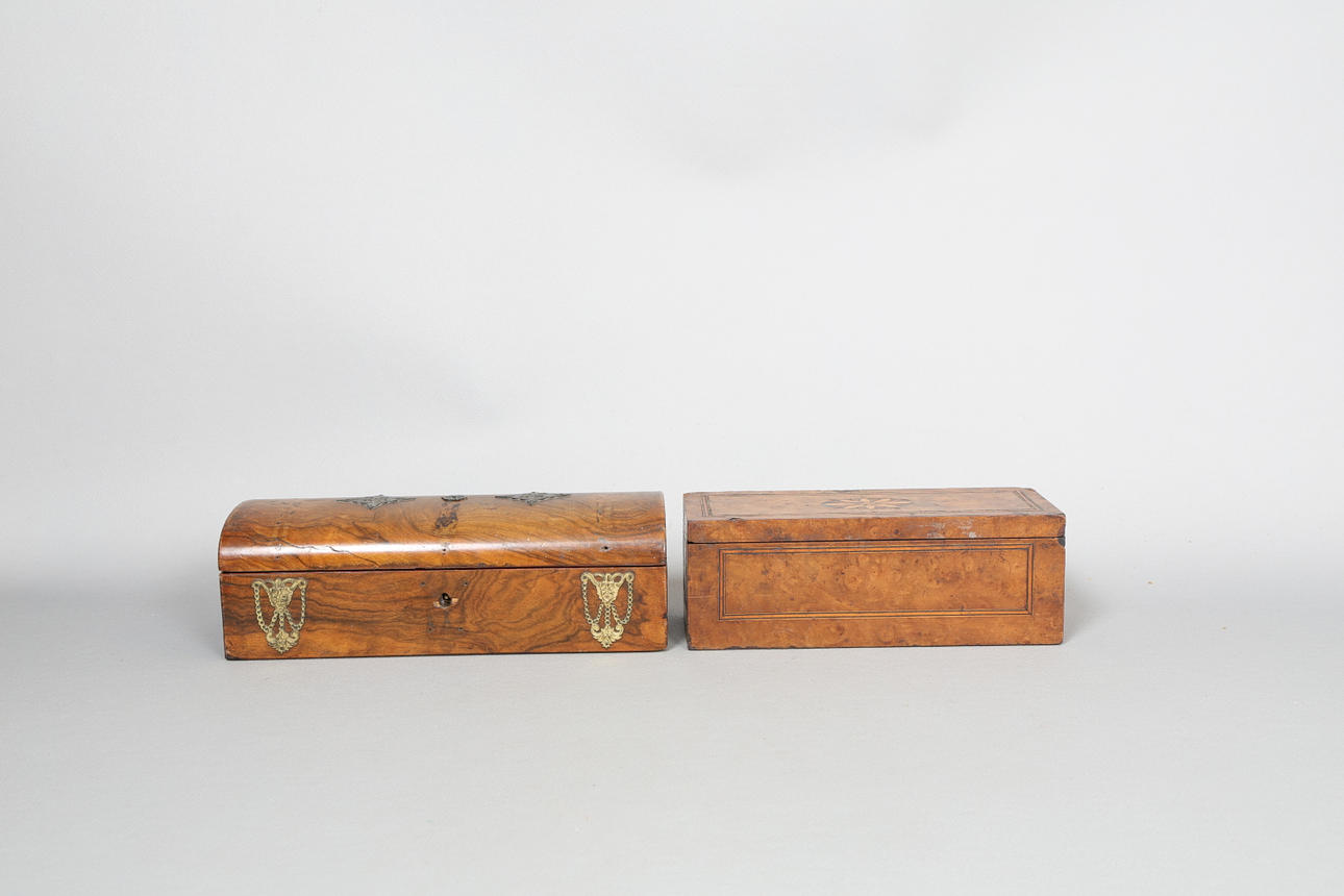 den kupolformade lådytan repas och verkar sakna nyckelhålskåpa och verkar ha haft fler fästen på locket, den andra lådan med spån och förluster på fanern.