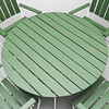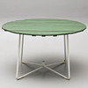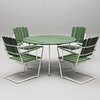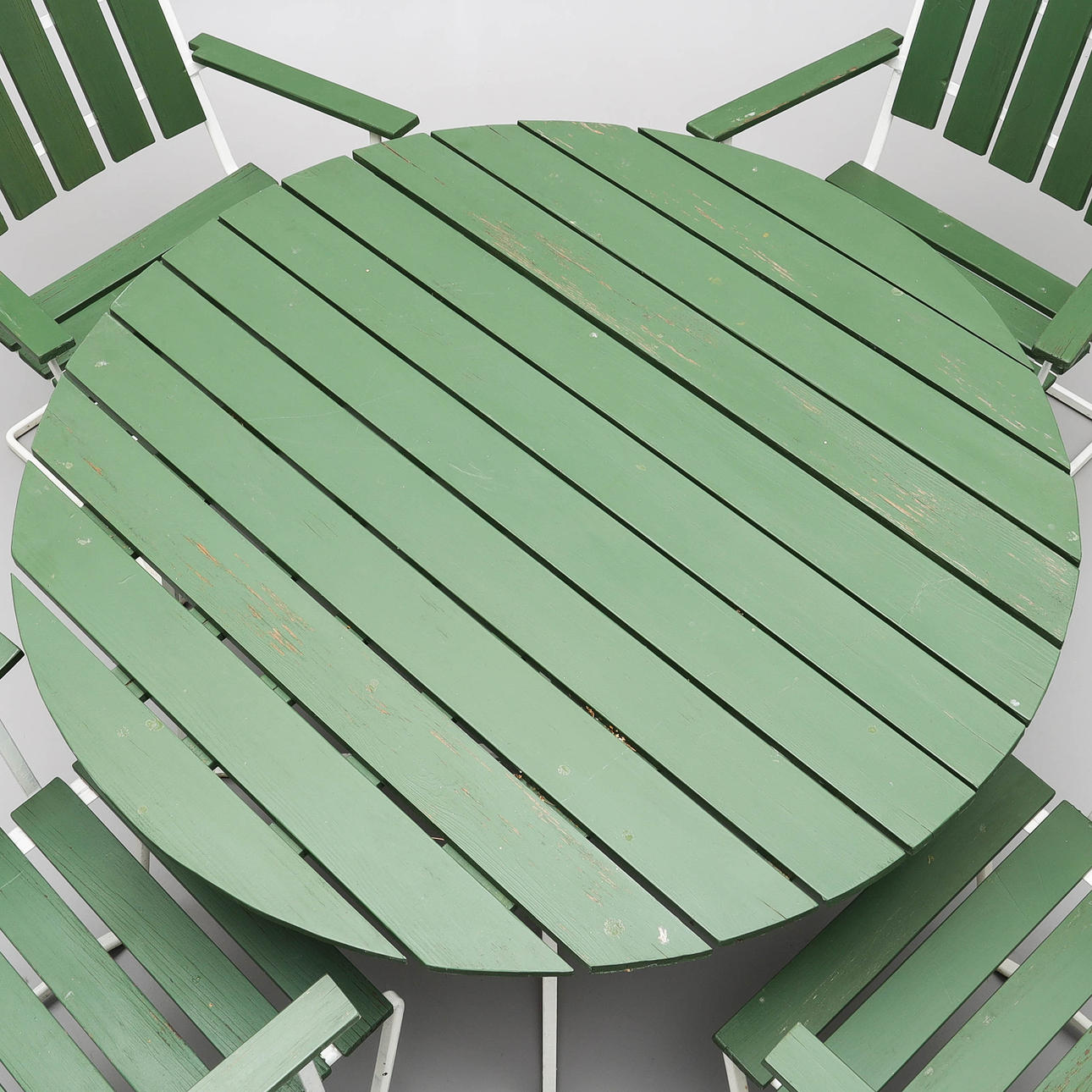 Bord diameter 121, höjd 70 cm. Stolar höjd 67, sitthöjd 41, djup 65, bredd 63 cm.