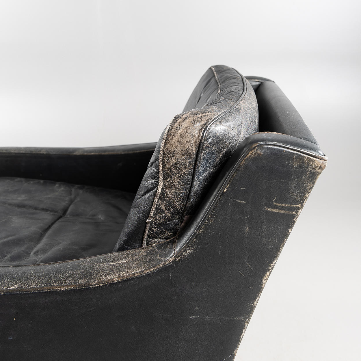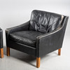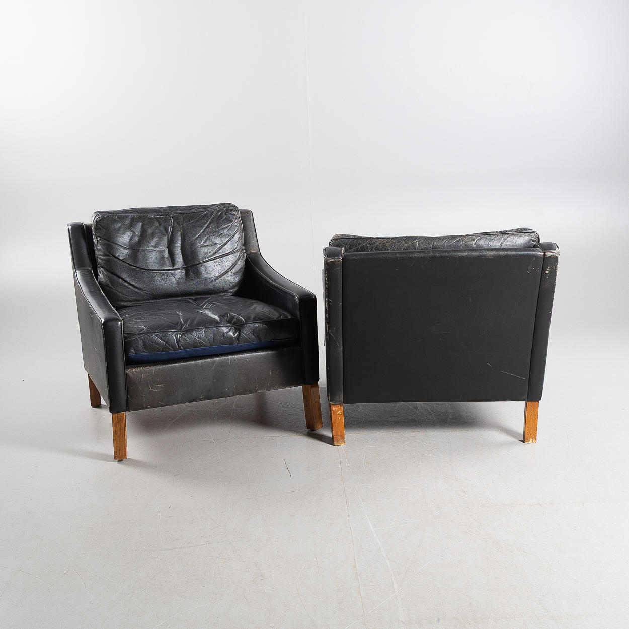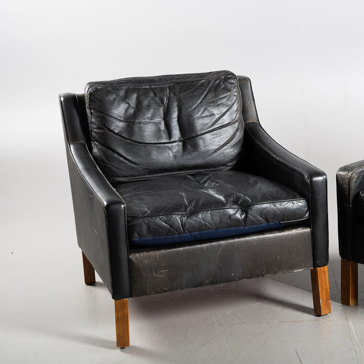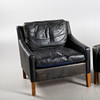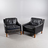 Svart läder, lösa plymåer, betsade ben, höjd ca 70, 73x80 cm, sitthöjd 42 cm.