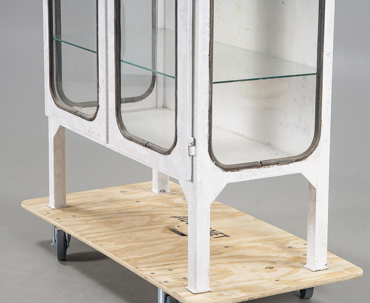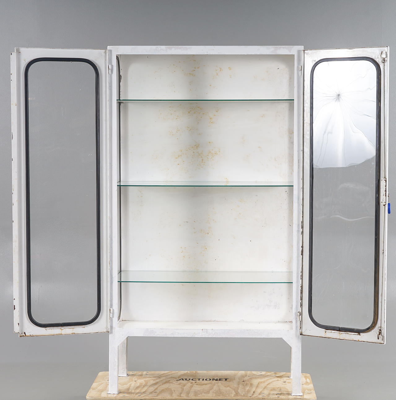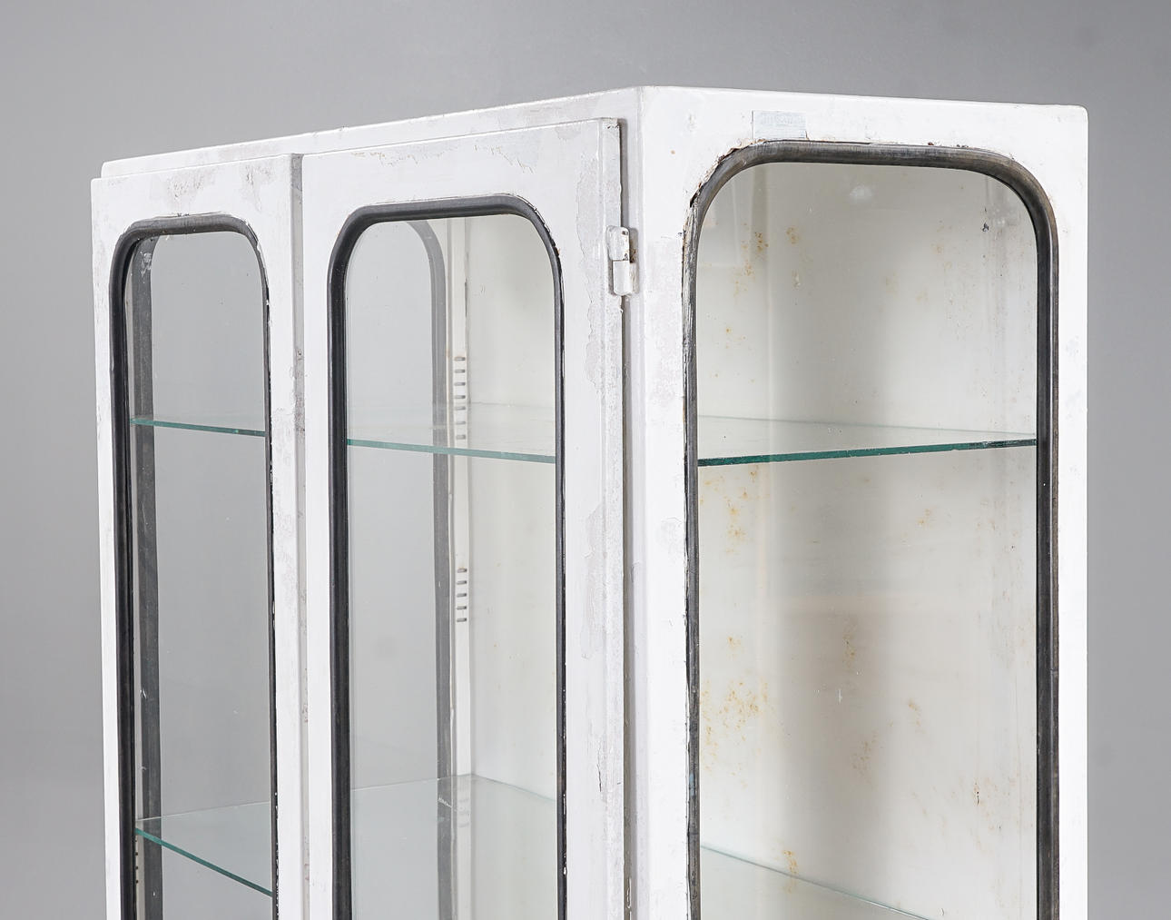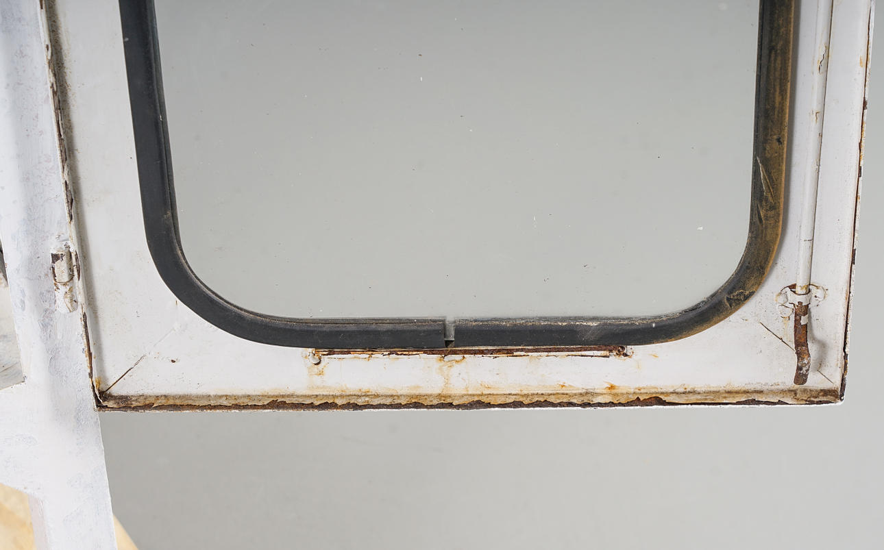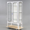 Stomme i metall, inrede med glashyllor, glasrutor med svarta gummilister.