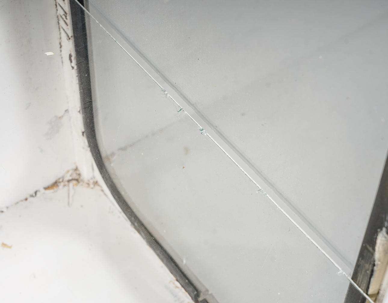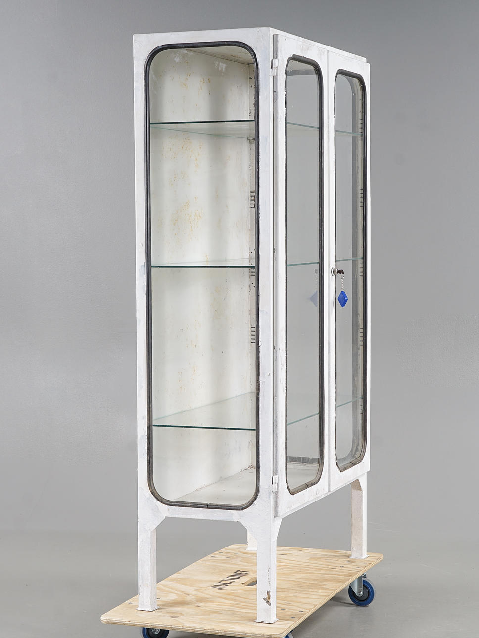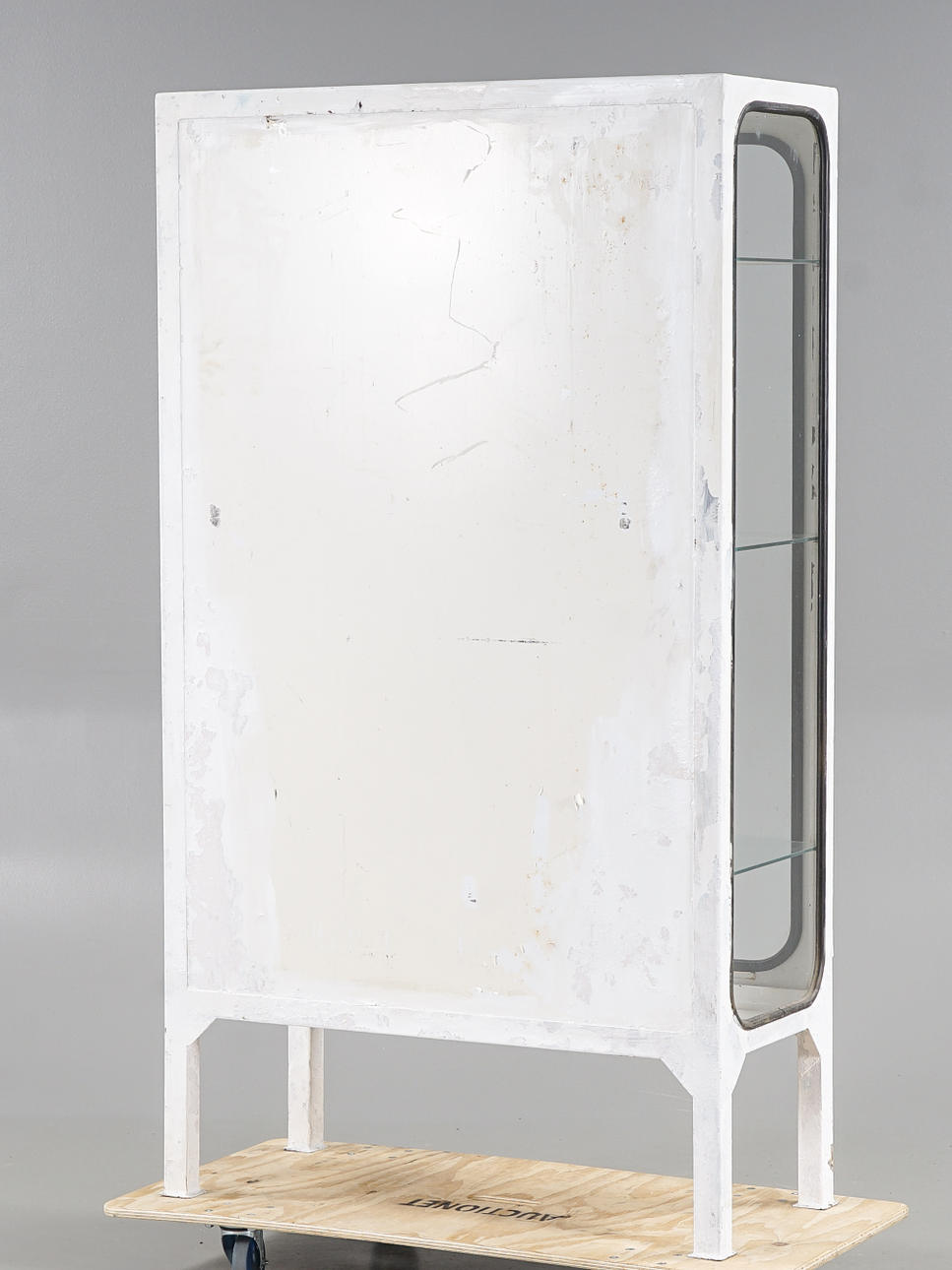 Stomme i metall, inrede med glashyllor, glasrutor med svarta gummilister.