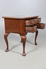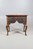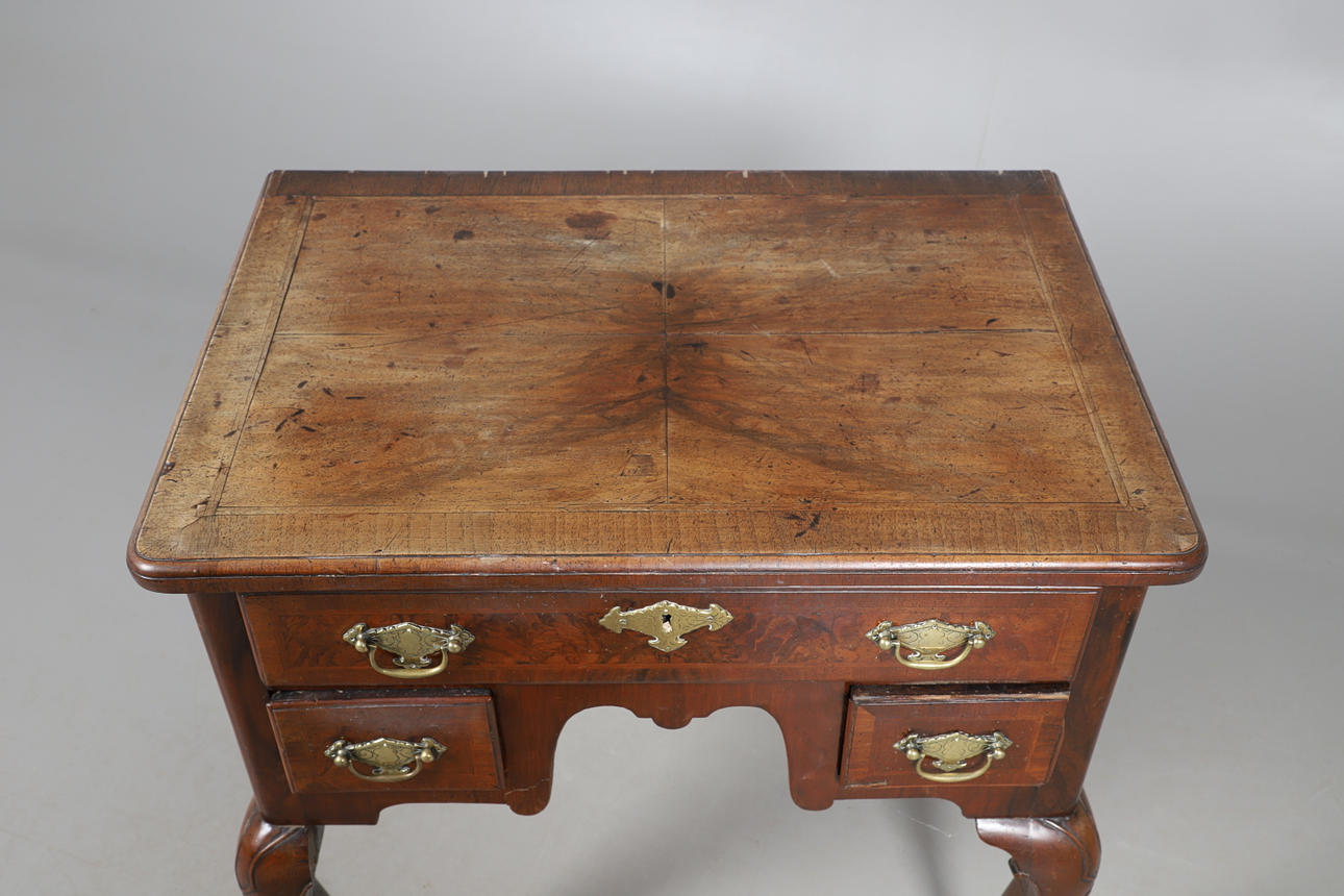 Med en kvartsfanerad och inlagd topp, med en lång låda och två korta lådor, ett format förkläde och stödd på cabriolben. Vissa reparationer och maskhål. Topp 71 cm x 48 cm 71,5 cm hög.