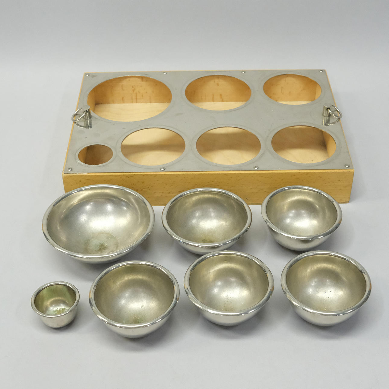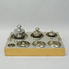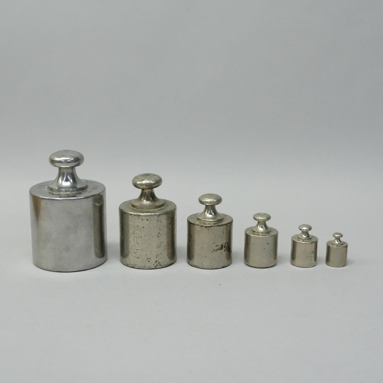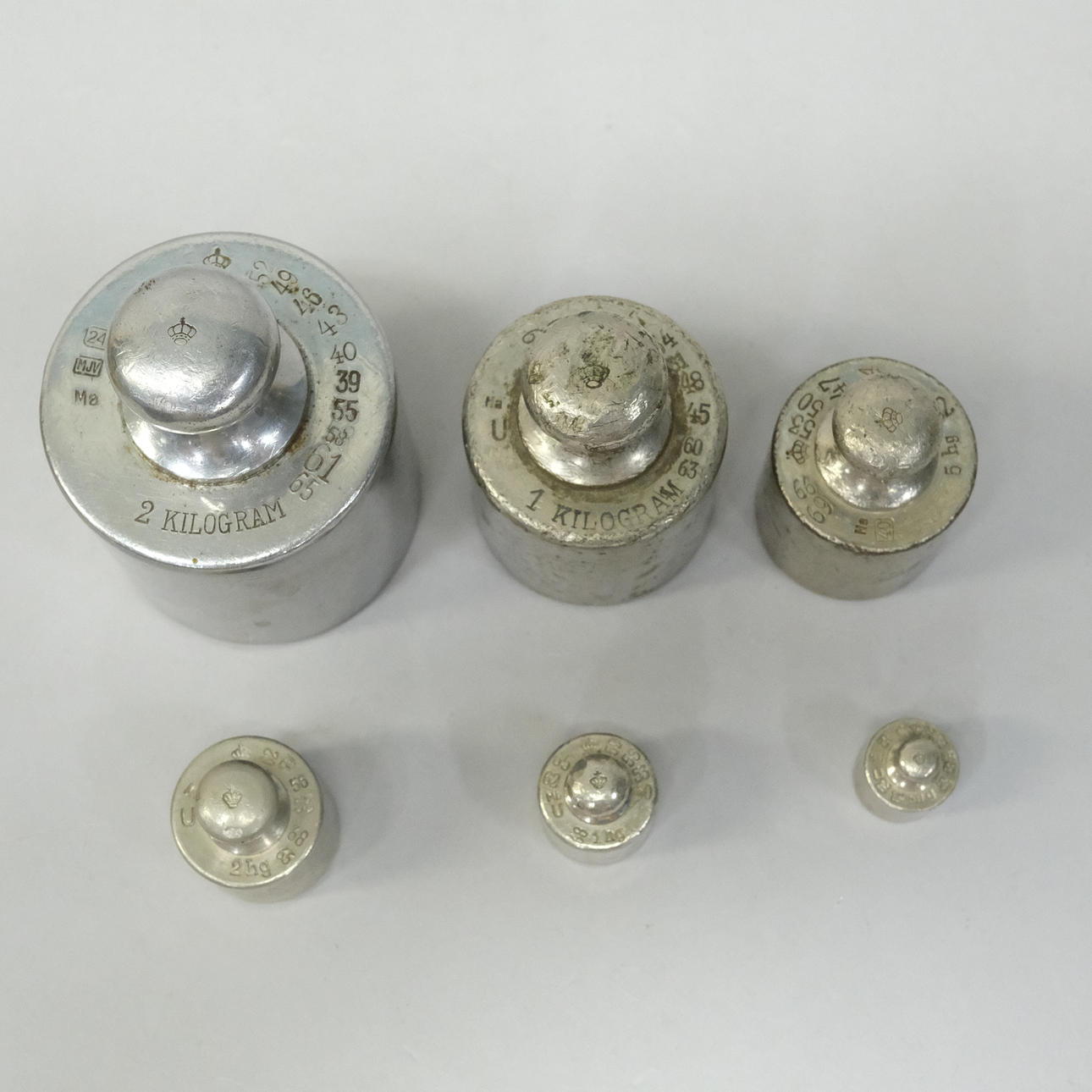 Följande vikter finns: 2 kg, 1 kg, 5 hg, 2 hg, 1 hg och 50 g.