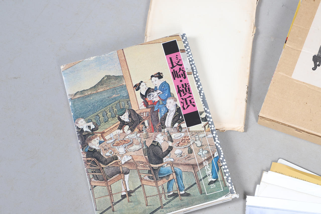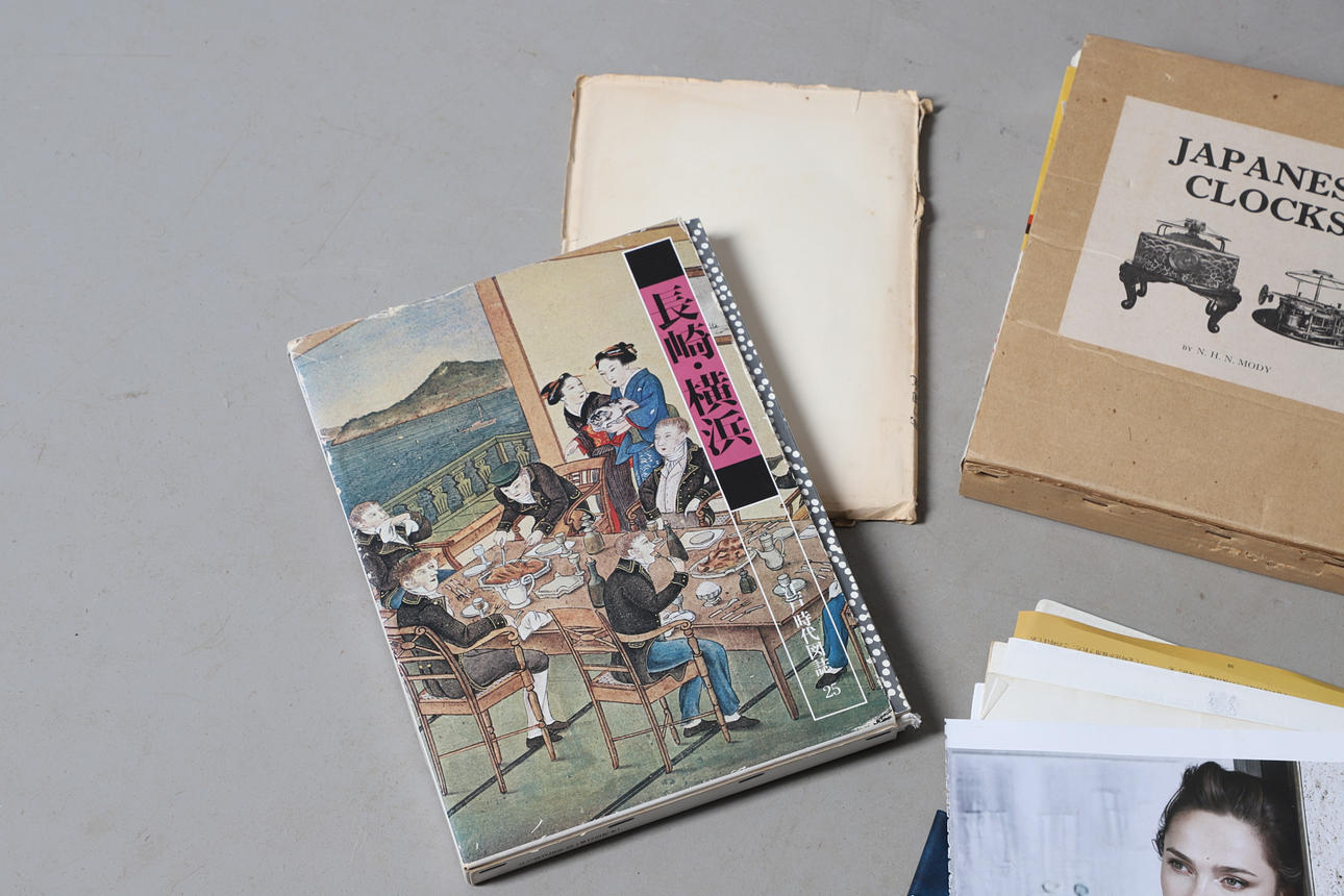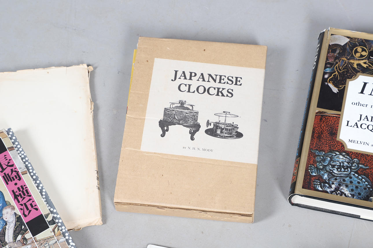 Olika böcker inklusive japanska klockor (N H N Moody, Inro & Miniature forms of Japanese Art (Melvin & Jahss), böcker om japanska tryck inklusive Karakuri-Zui av Hanzo Hosokawa (50 exemplar, 1956) och olika anteckningar och pappersarbete.