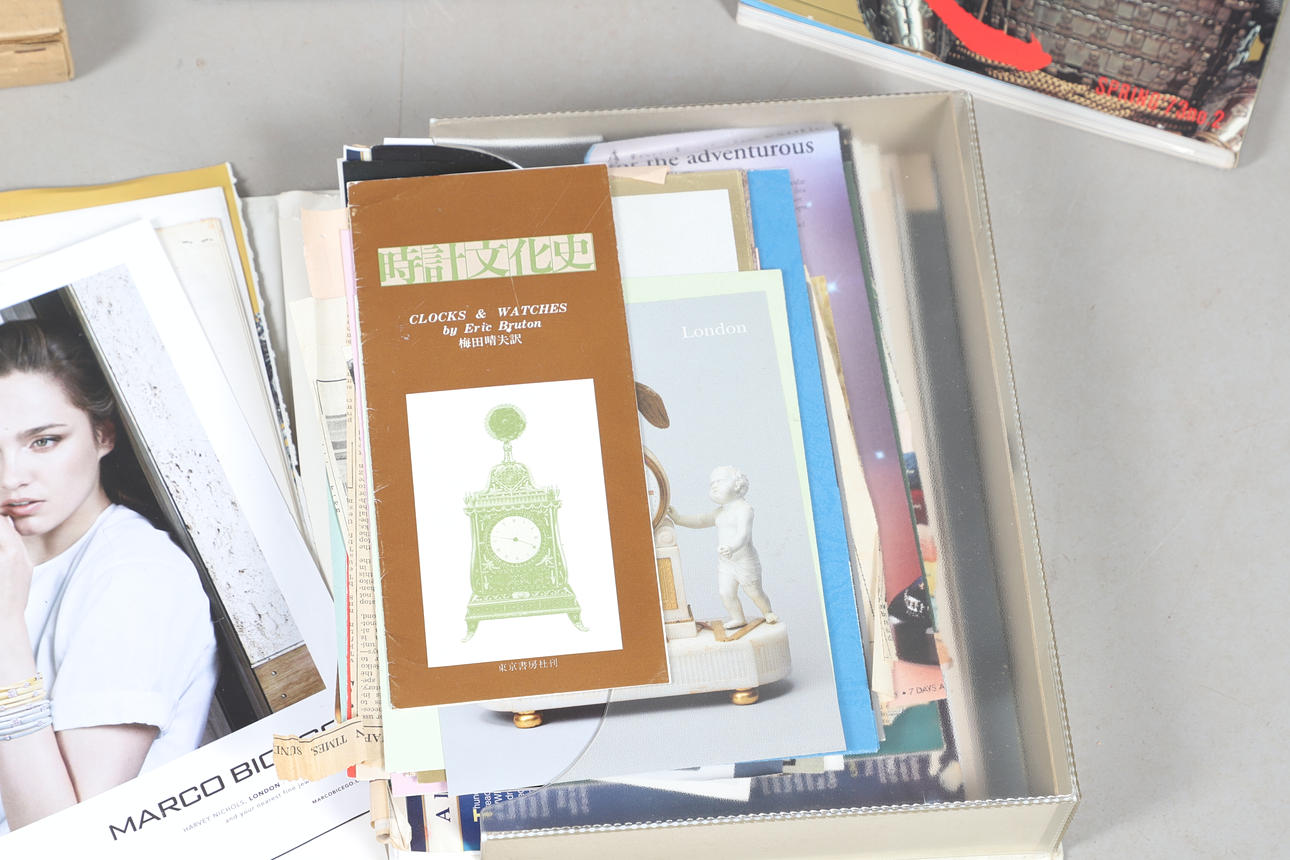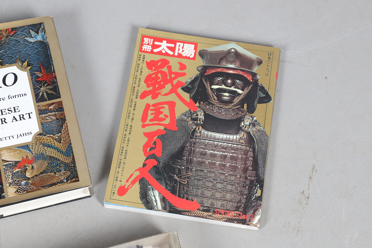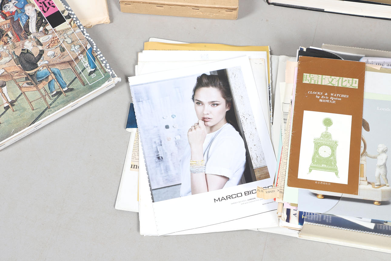 Olika böcker inklusive japanska klockor (N H N Moody, Inro & Miniature forms of Japanese Art (Melvin & Jahss), böcker om japanska tryck inklusive Karakuri-Zui av Hanzo Hosokawa (50 exemplar, 1956) och olika anteckningar och pappersarbete.