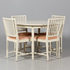 Bord: Diameter 105,5 cm. Höjd 73 cm. 4 st stolar: Bredd 45 cm Djup 49,5 cm. Höjd 85 cm. Sitthöjd 44 cm.